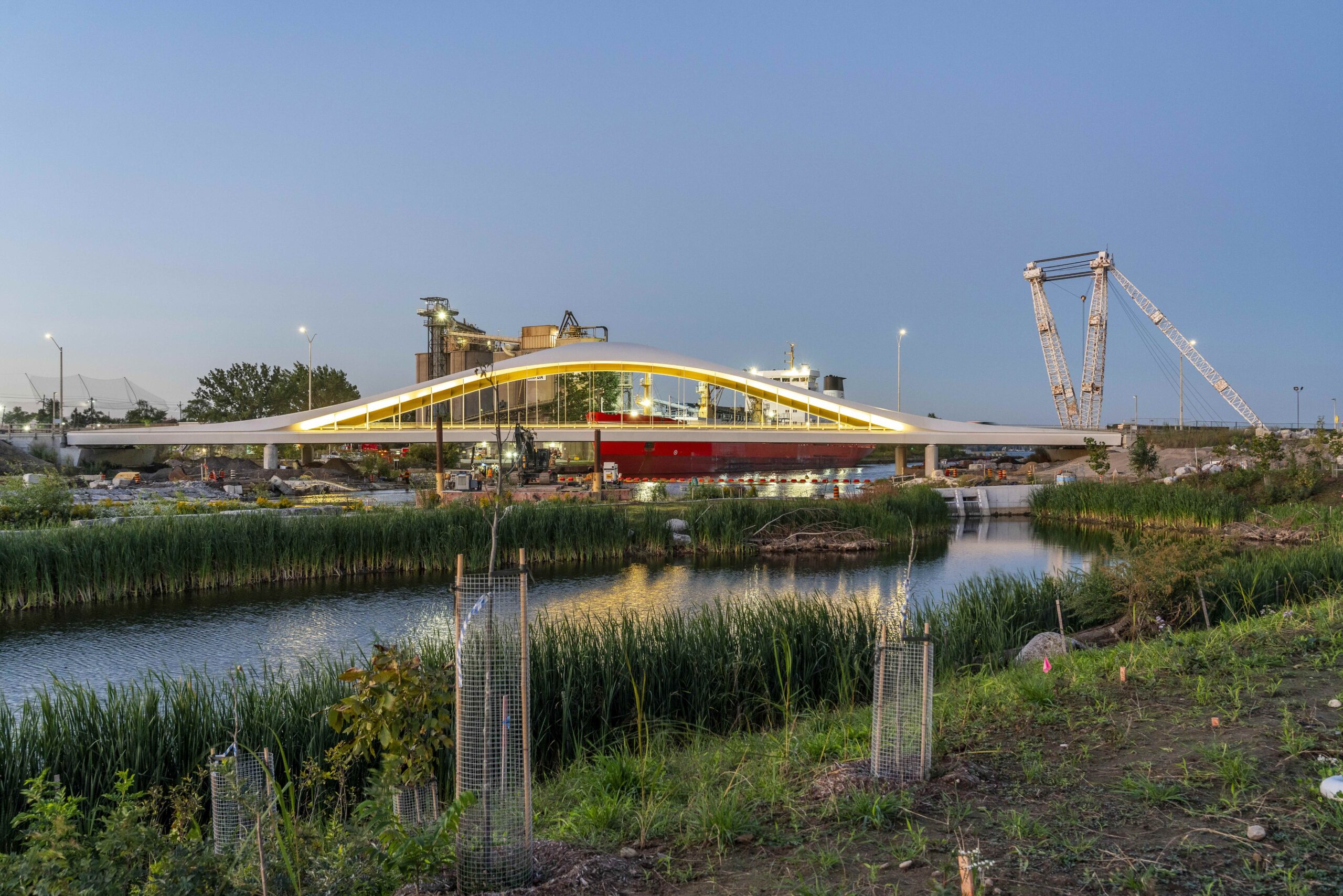 The multi-decade, multi-purpose Port Lands Flood Protection project intervenes at one of the waterfront’s largest industrial white elephants, where over a century of outmoded urban planning generated a litany of environmental and other challenges. Led by landscape firm MVVA – which won an invited competition by Waterfront Toronto in 2007 to “renaturalize” and remediate the Port Lands and prepare it for future development – the ecological-infrastructural project celebrated its first public-facing milestone this summer, with the opening of Biidaasige Park. The new park, whose name means “light shining toward us” in the Ojibwa language, is just the tip of the Port Lands effort, a more than $1 billion, generational feat in ecological engineering and planning.