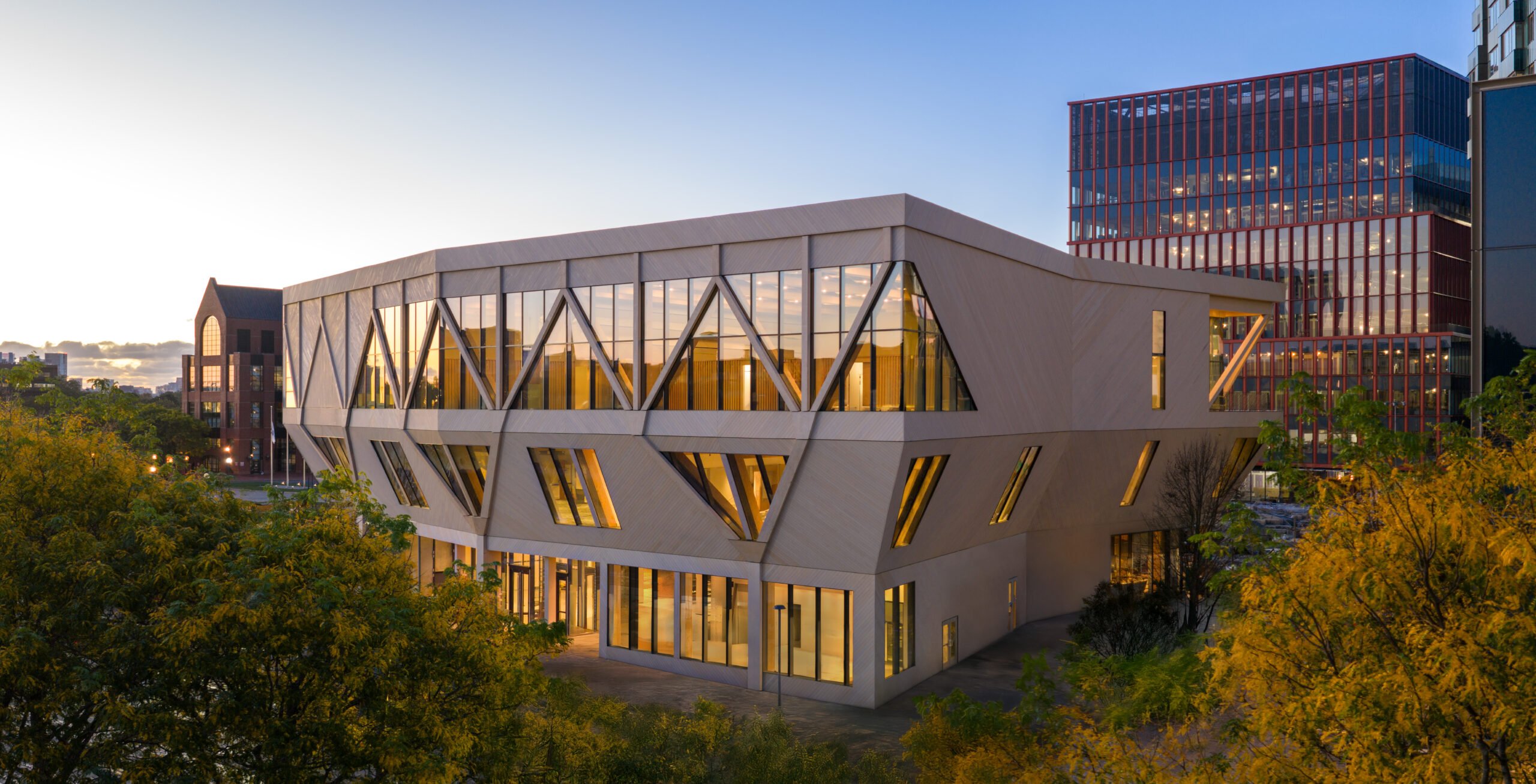 At the top level, there are expansive views of the campus and city framed by the building’s timber columns. On the north side is the Canopy Hall, the main gathering space, and then a terrace along the south façade. There’s also a pre-function area with other breakout spaces around it. We thought carefully about where to put that main space, and we landed at the top so that visitors could have the feeling of being “up in the canopy.”