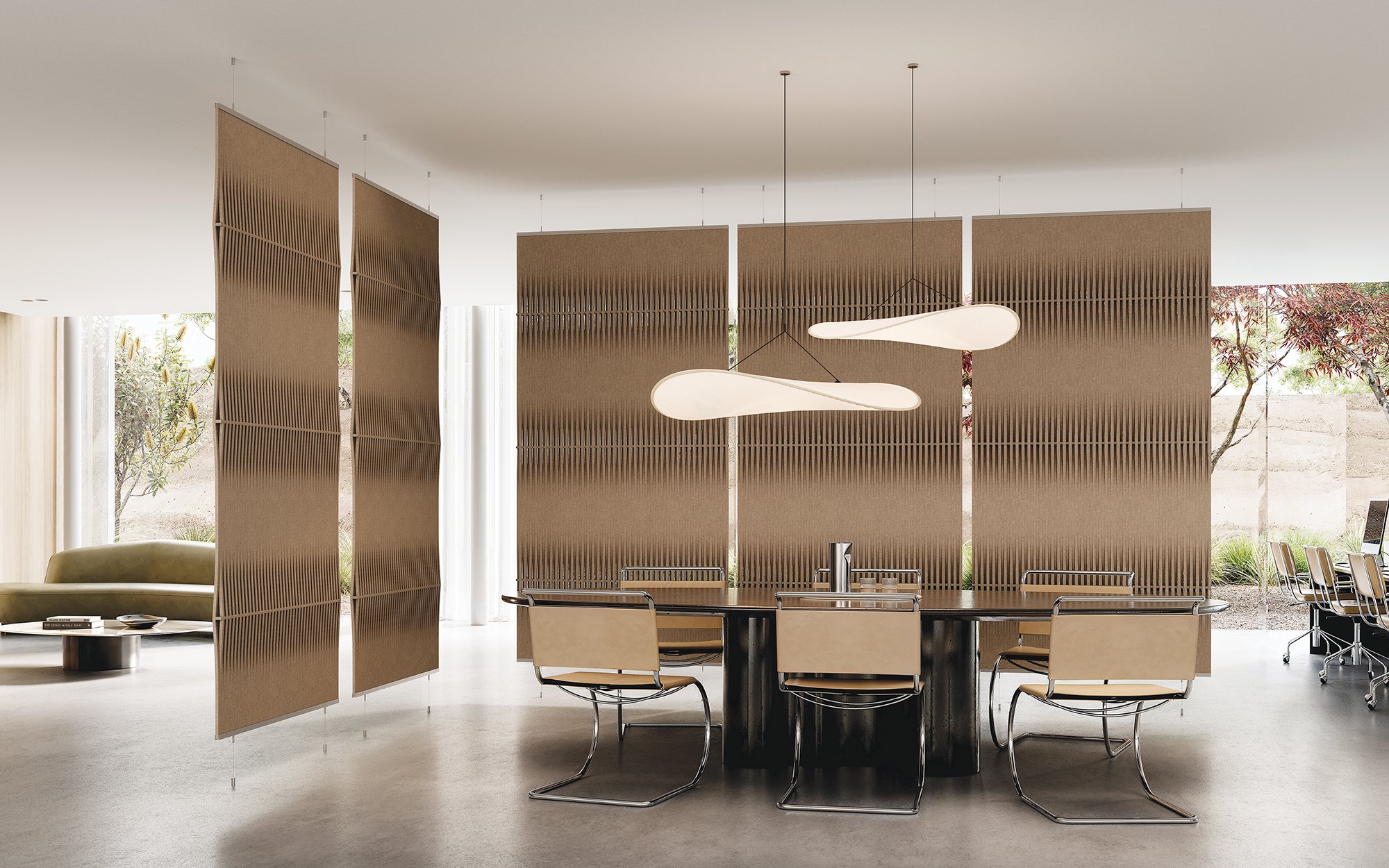 Designed by Rafa Ortega, Pixels is a retractable room divider system that offers a contemporary reinterpretation of the classic vertical blind. With adjustable, vertically suspended lamellas, it provides glare and privacy control while supporting spatial and acoustic zoning. Available in four designs and 36 colors, Pixels can be used along window walls or as freestanding dividers in open-plan environments.