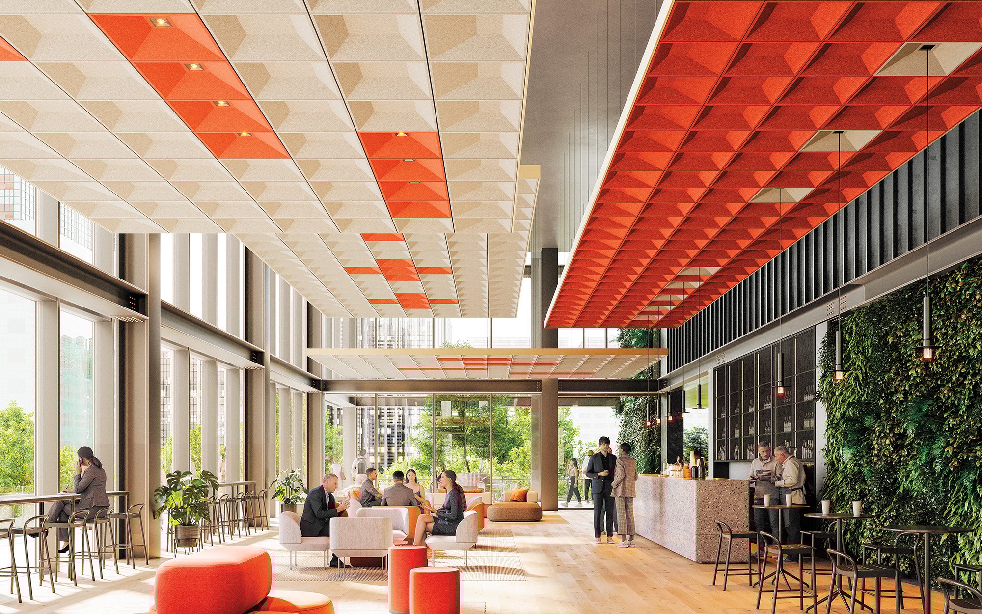 Turf’s new ceiling product Pantheon is designed to sculpt the ceiling plane and can be supported using a standard tee grid. It features a coffered form that can be configured with open and closed tiles to create graphic patterns and is available in standard 24-by-24-inch tiles finished with nine-millimeter PET felt in a range of colors and textures.