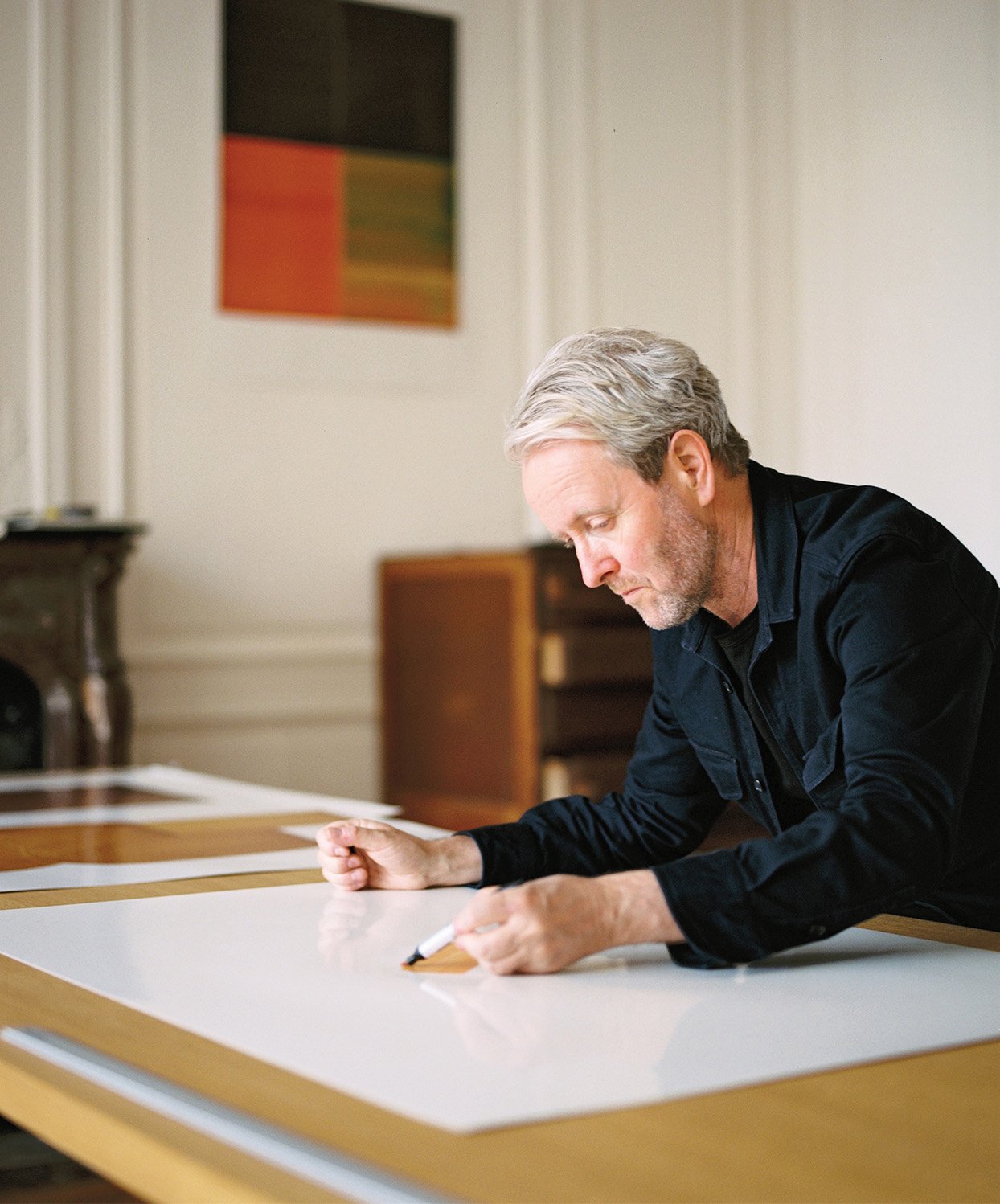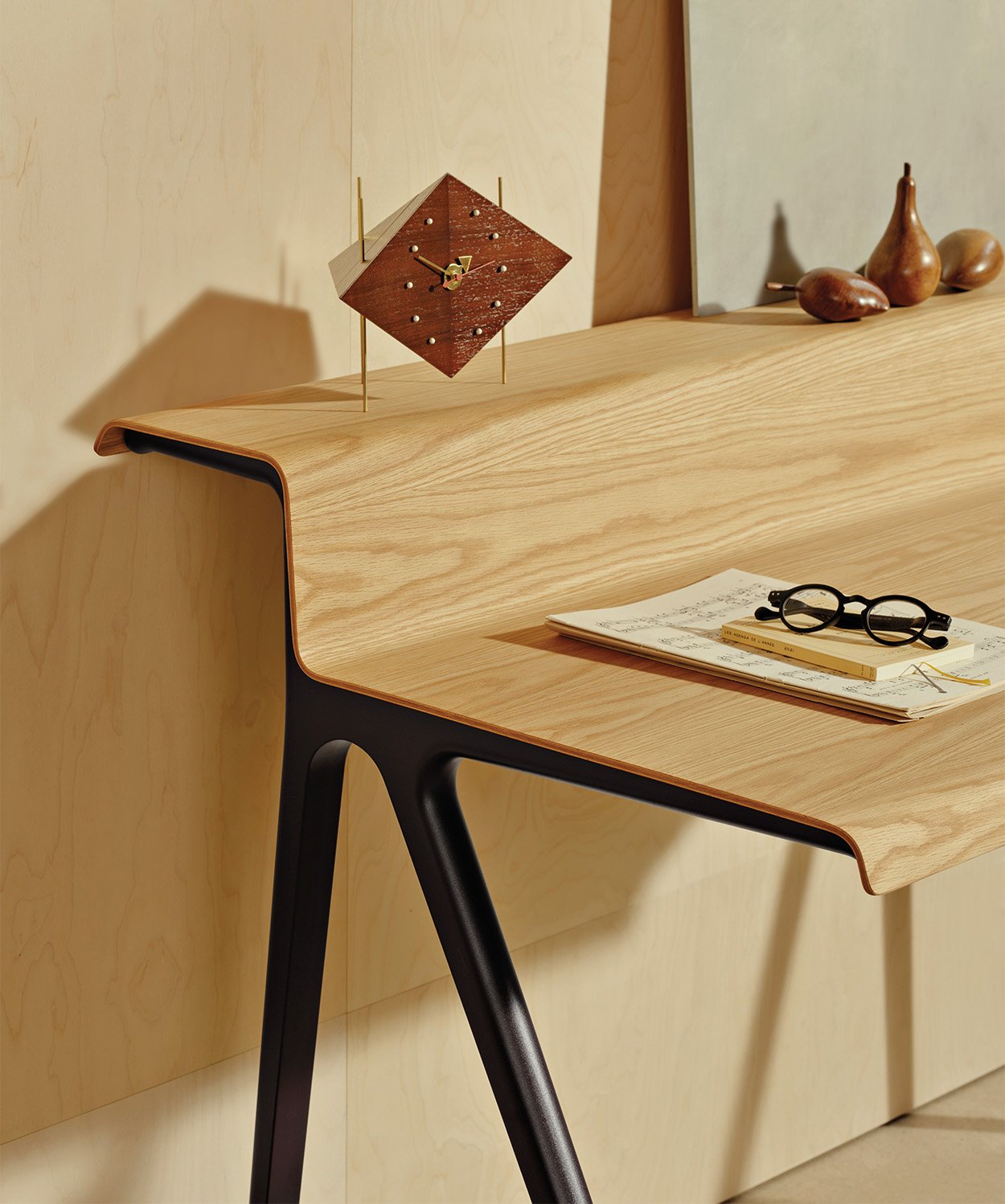 Ronan’s design language, which underscores simplicity—peppered with subtly playful and sophisticated notes—is evident in the resulting product, which is “a reduction of the desk to a form that is essential and visceral.” Ronan calls it a “naked solution”: a thin wooden surface offered in a dark or natural oak veneer on a die-cast aluminum base in a choice of three colors. On the one hand, its stepped silhouette is thoughtful and whimsical: Viewed from the side, its metal frame, with non-perpendicular legs, evokes a serif typeface—hence the name Courier. But it also has a practical purpose: The lower desktop, measuring 47¼ inches wide and 20 inches deep, has enough surface area to hold a laptop and essentials like a cup of morning joe, while the slim raised platform at the back, which adds an additional 9.7 inches, can accommodate a separate screen.