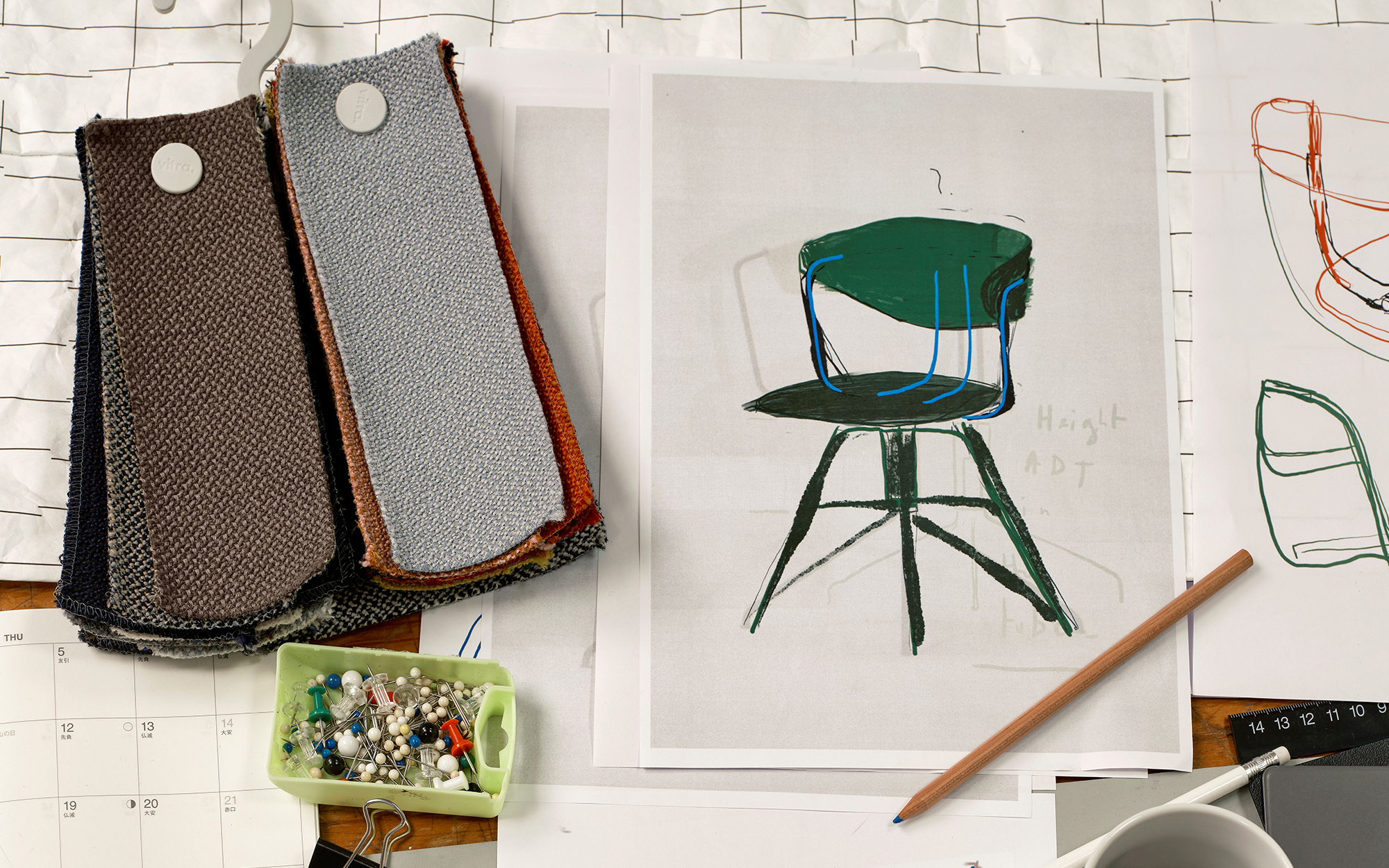 The seat and back are available in either plywood with a natural oak finish or 100 percent recycled postindustrial polyamide in basic dark (black) or gray. A zipper-fastened upholstered seat and back covers are easily removable for washing and are offered in a wide array of fabrics—from recycled polyester to a wool-polyester blend—to further customize the chair’s appearance. Meanwhile, its aluminum base can be completed with casters or glides. The bases can all be finished in deep black, but the four-star base is additionally available in soft light, blasted aluminum, or bottle green.