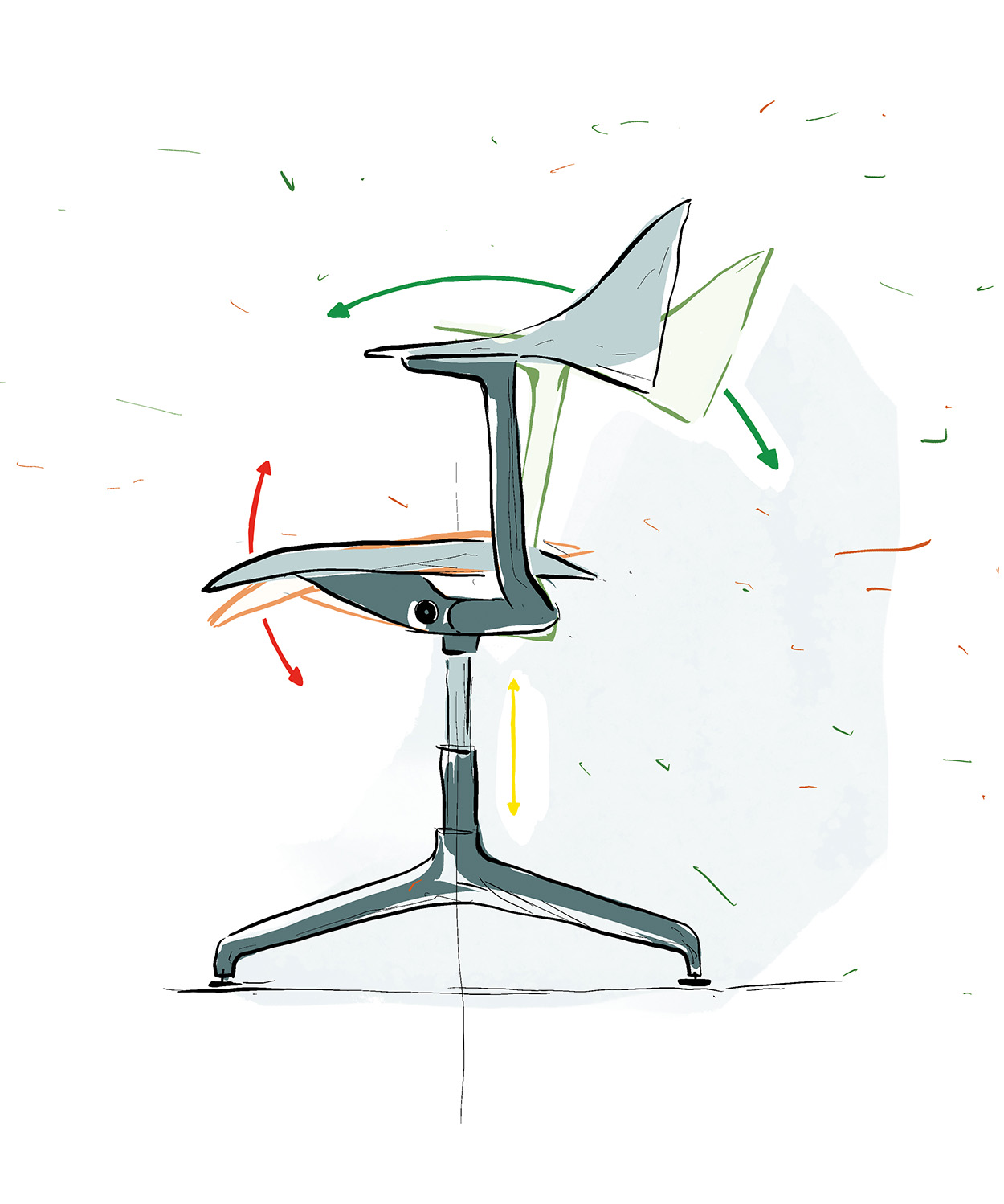 The aforementioned twist is Mynt’s patented mechanism, which enables the seat to move independently of the back. Weight-activated, it adapts to various sitting postures without any external knobs, dials, or levers to fuss with, save for the height-adjustment paddle. “Instead of having just a couple of settings, you’ve got a million positions—the body is surfing on the chair,” the designer explains. Like Courier, this chair was designed with the new office in mind, whether it’s at home or the workplace, with this mechanism specifically tailored for shared environments, where sitters may have a wide range of body types and postures.