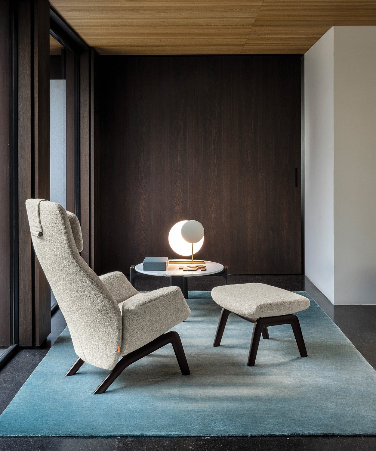 Jean-Marie Massaud has reimagined the Downtown office chair as a versatile lounge armchair. It features an ergonomic headrest, customizable upholstery in Pelle Frau® leather or fabric, and a 360-degree swivel base with automatic return or a fixed wooden trestle base in solid ash. The seat, backrest, and armrest structure are made of molded polyurethane foam with metal inserts and padding of differentiated-density polyurethane foam with quilted wadding.