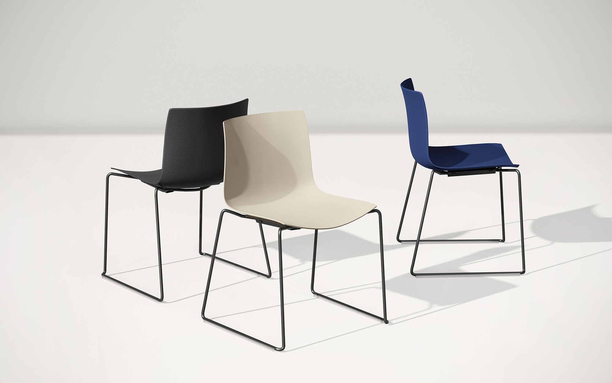 Designed by Lievore Altherr Molina in 2004, Catifa 46 has recently received updates with contemporary materials, resulting in the Catifa (RE) 46, which features a distinctive shell made from 100 percent recycled plastic. The shell is available in eight shades and pairs with three base options: four wooden legs, four steel legs, and a sled base. A new seat cushion, also available for outdoor use, is made from Breathair®, an elastomeric polyester. Optional armrests can be added to certain configurations, and Catifa (RE) 46 is also available as a stool in two different heights.