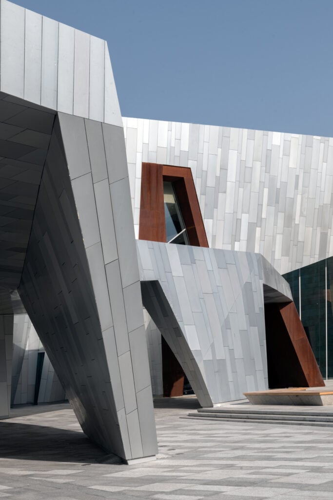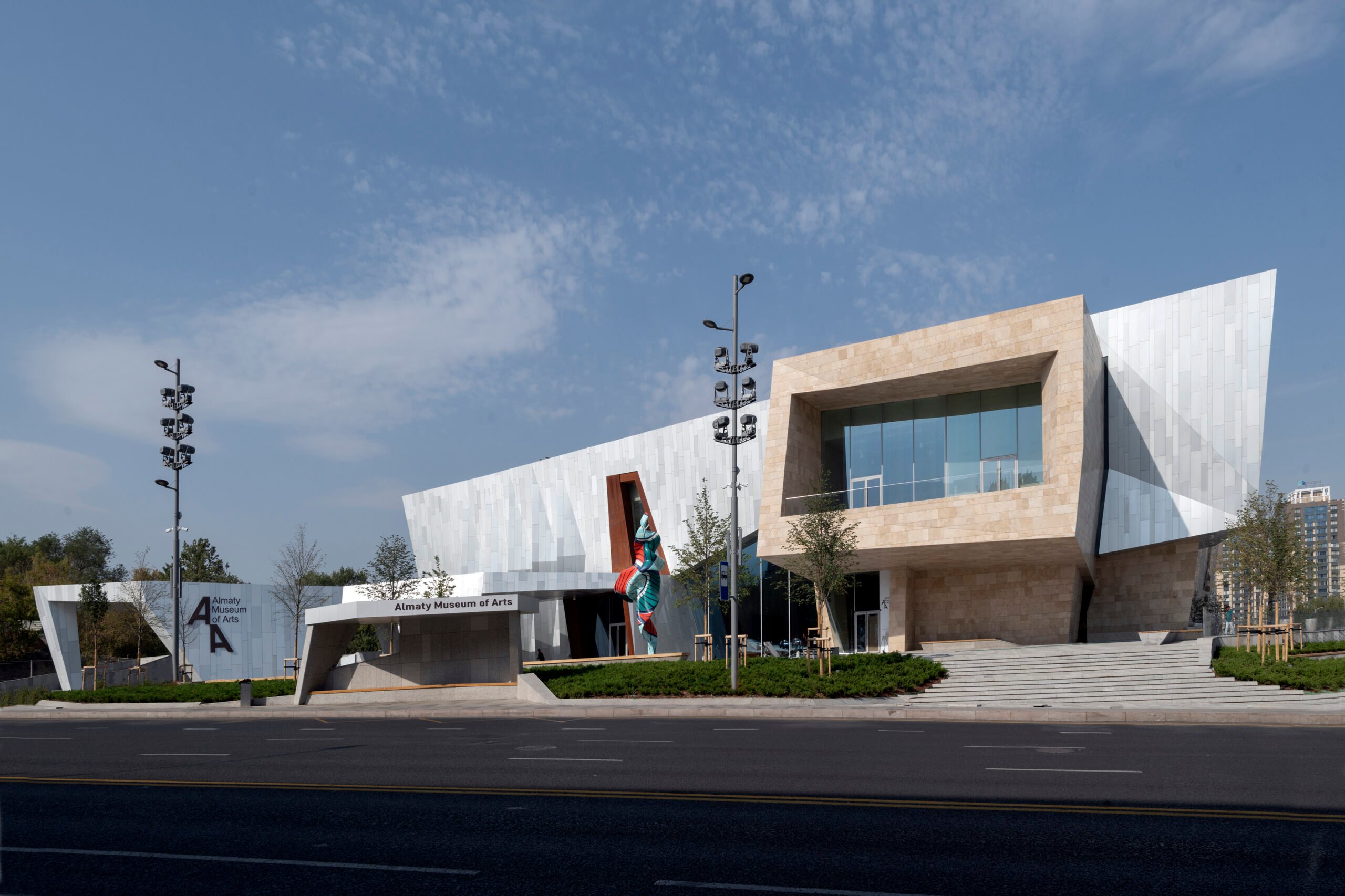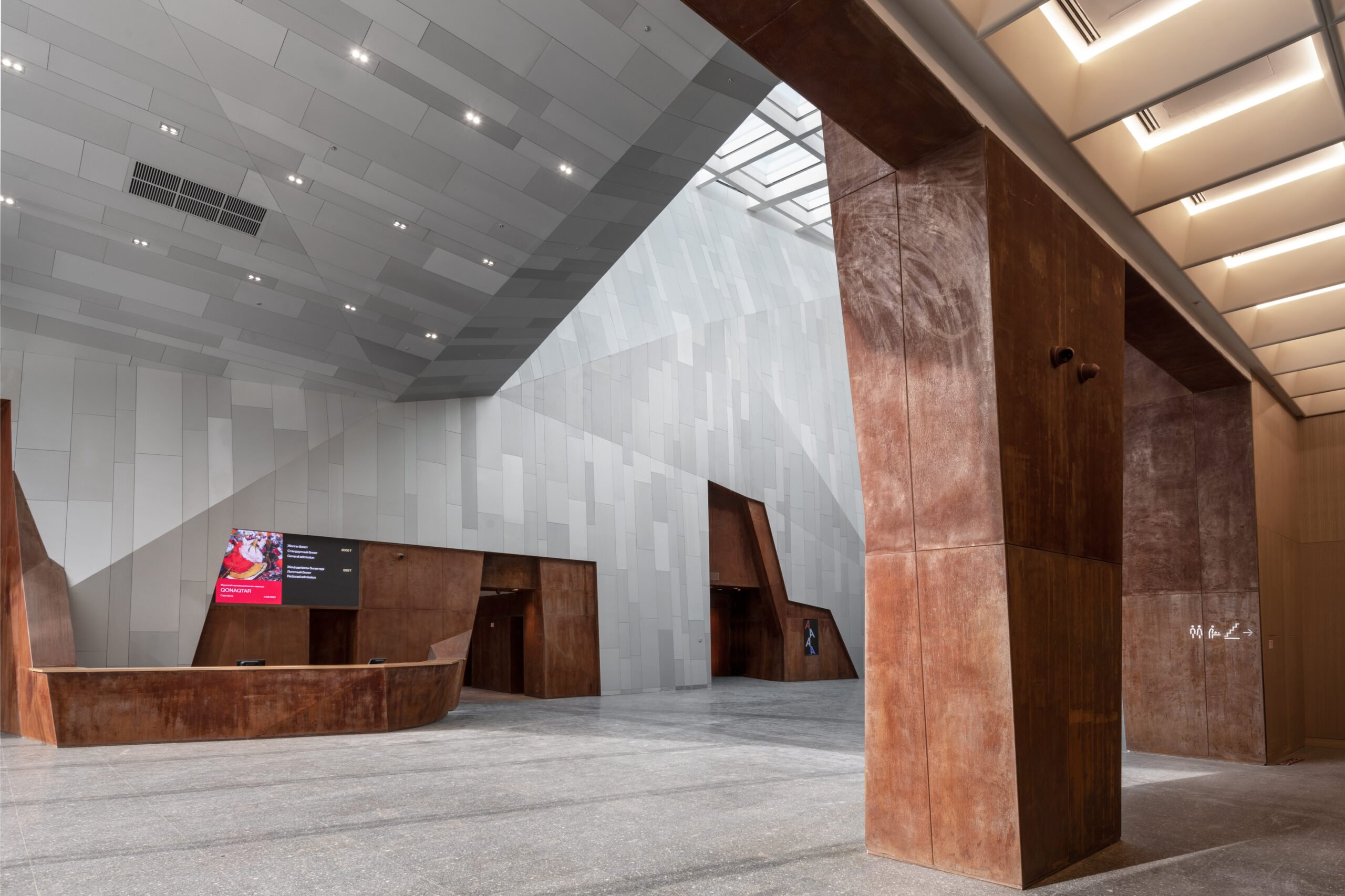 The material binary continues inside, with aluminum and limestone volumes that each border one side of the museum’s main hallway. It’s a nod to Kazakhstan’s wondrous Charyn Canyon about 120 miles away.