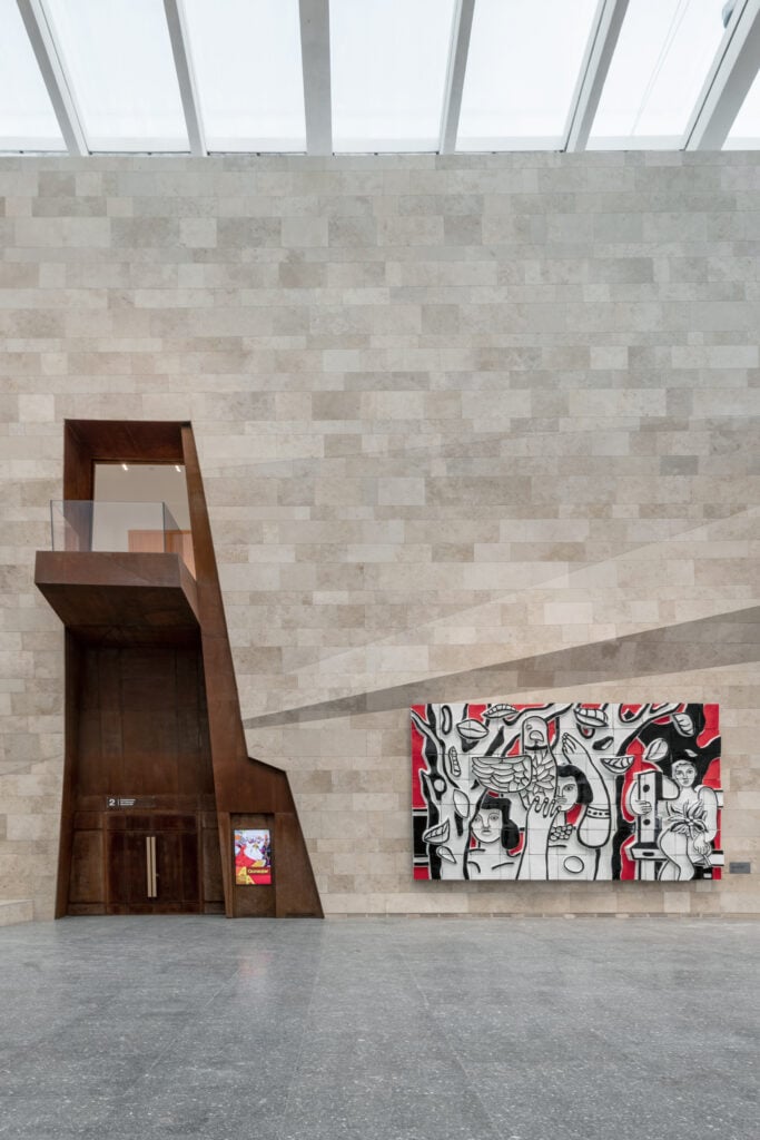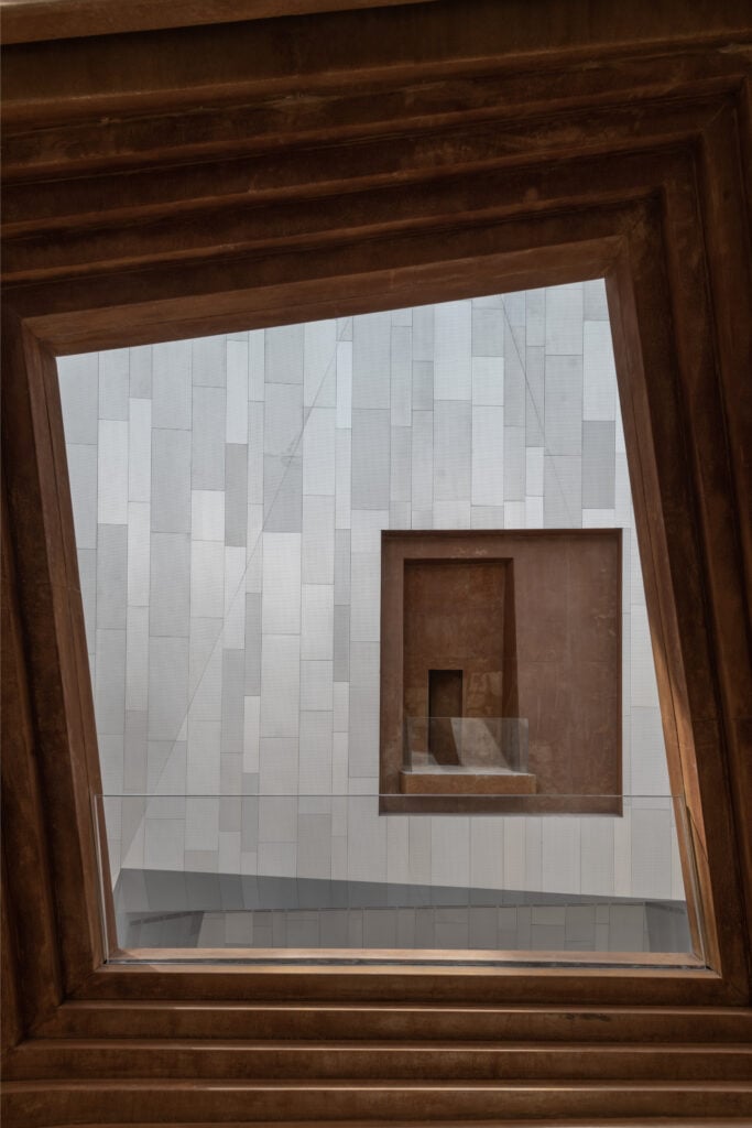 The museum’s interiors make use of Cor-Ten as the material for expressive doorways, casings, and window linings. The concept was geological, as Lanskbury explains, “that when you cut into surfaces there’s something different beneath” and Cor-Ten seldom seems so vibrantly orange as when against the muted limestone. The trouble is that the limestone and Cor-Ten pairing is so inspired that the aluminum portions look a bit anodyne by comparison. More has been done with the limestone otherwise; it morphs naturally into a grand stair and then into a bench, and more. Aluminum unfortunately reads just as cladding. Keep your gaze fixed on the good half.