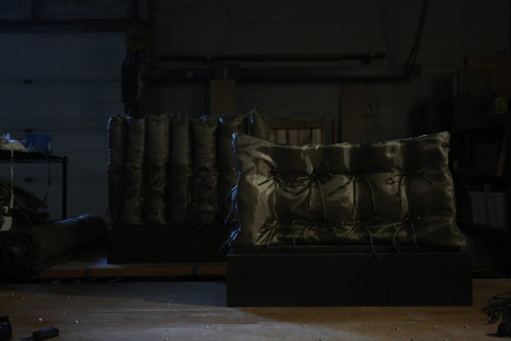 As an example, Skylar Tibbits and I are trying to invent a new, 100-percent stone construction system as part of a grant. We’ve developed these glossy, shimmery, green-gray pillowed walls, made of melted and spun basalt textile.