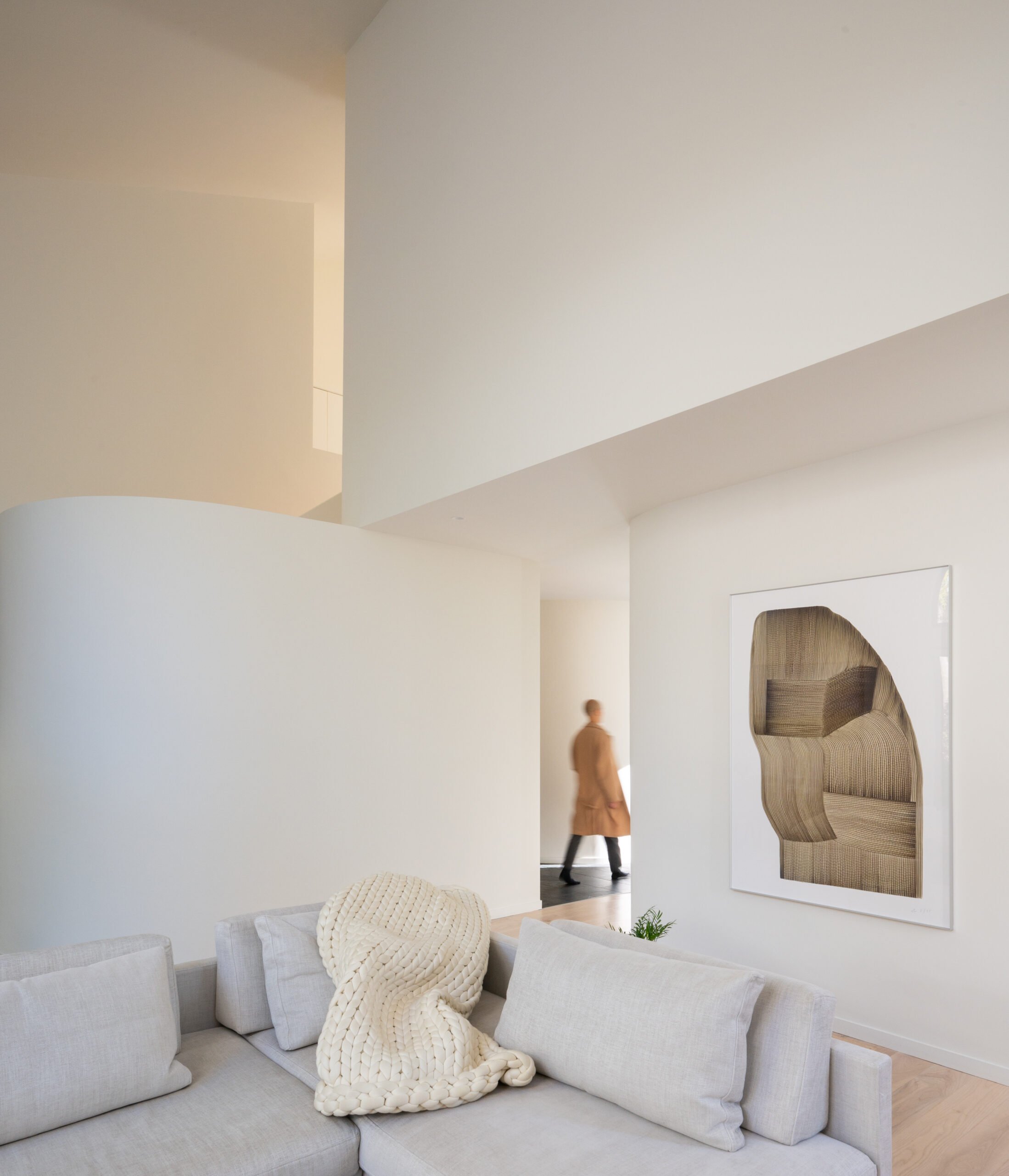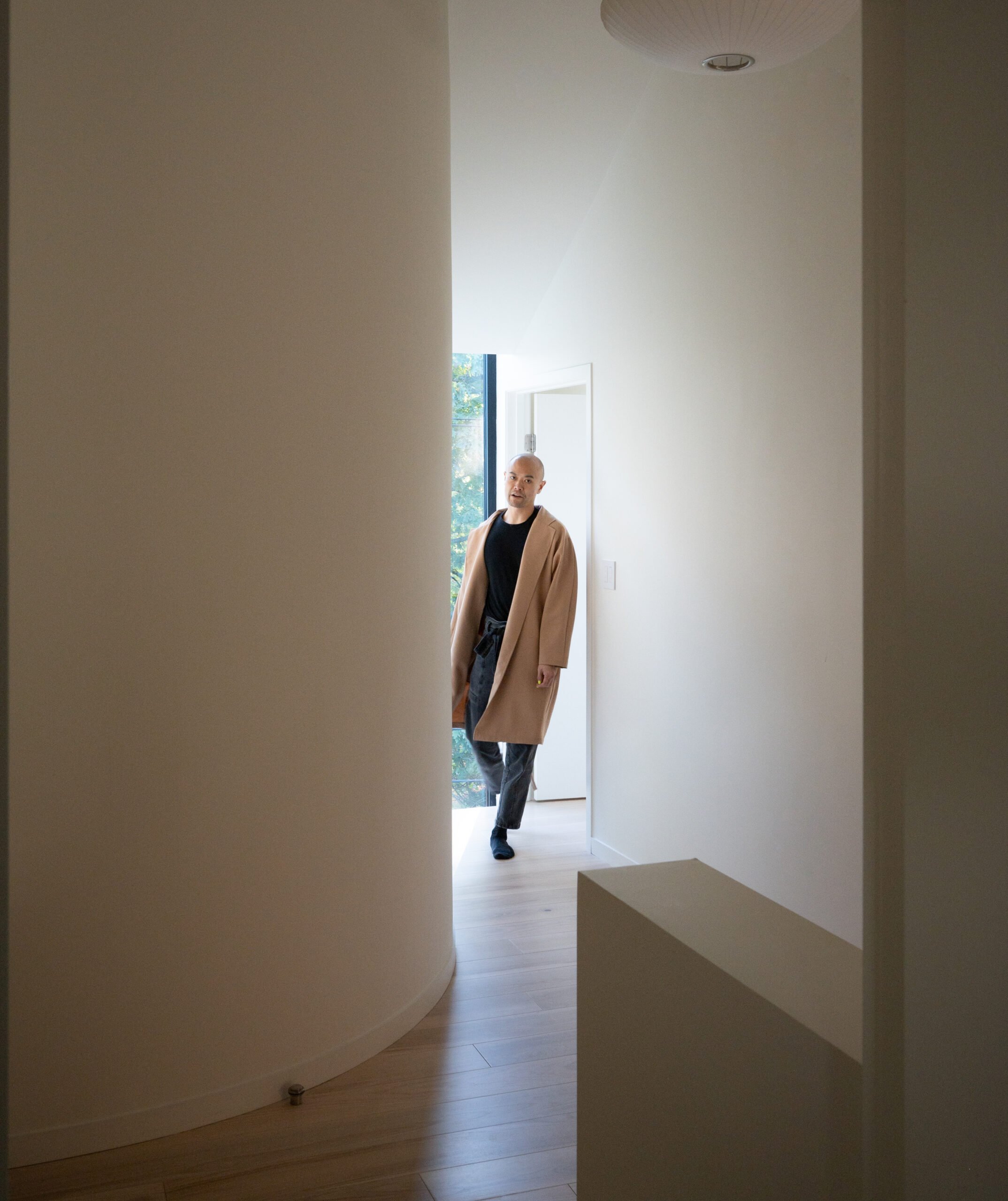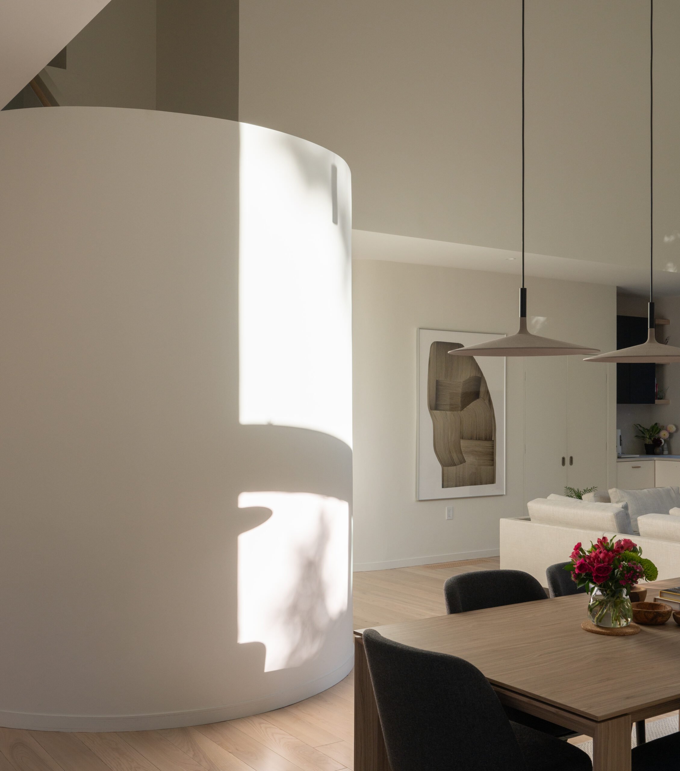 The edge of the island is reinforced by a ceiling height transition, and the point of inflection in a wall that arcs away to hug the stair. Move out from under the lower kitchen soffit, and you see the long, high slot of a window above the living room’s quasi-hearth – through which you can glimpse the komorebi of neighboring trees, or, at serendipitous passing, the alignment of a perfectly framed full moon.