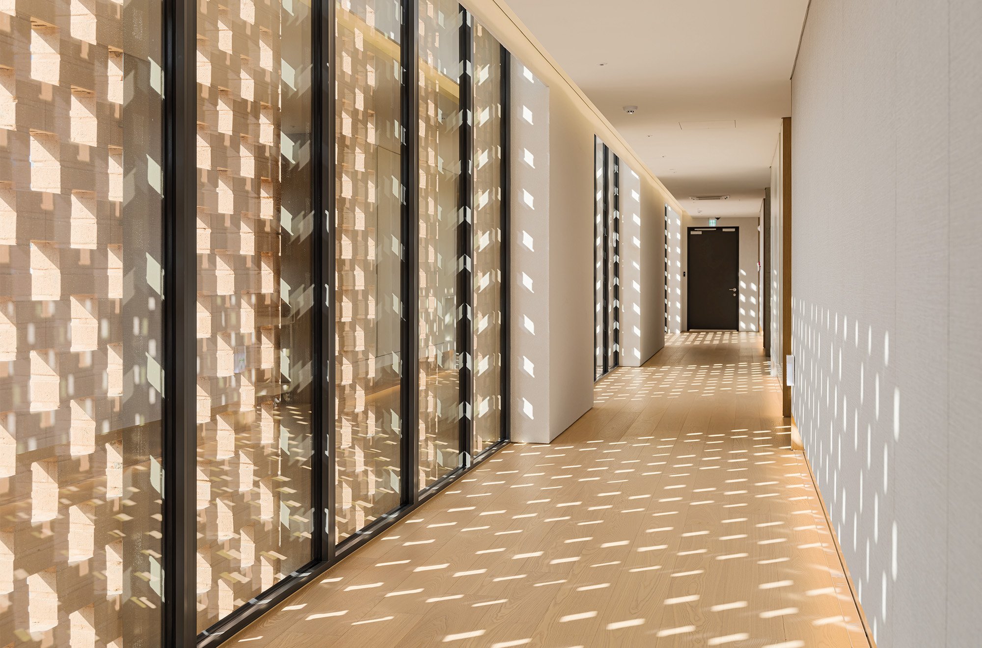 “The brick screen facade on the southern side adopts a spatial stacking method, creating an effect reminiscent of a delicate curtain,” Kim explains. “This approach was designed to cast shadows along the corridors, evoking the feeling of walking along a path where light filters through the leaves.”
