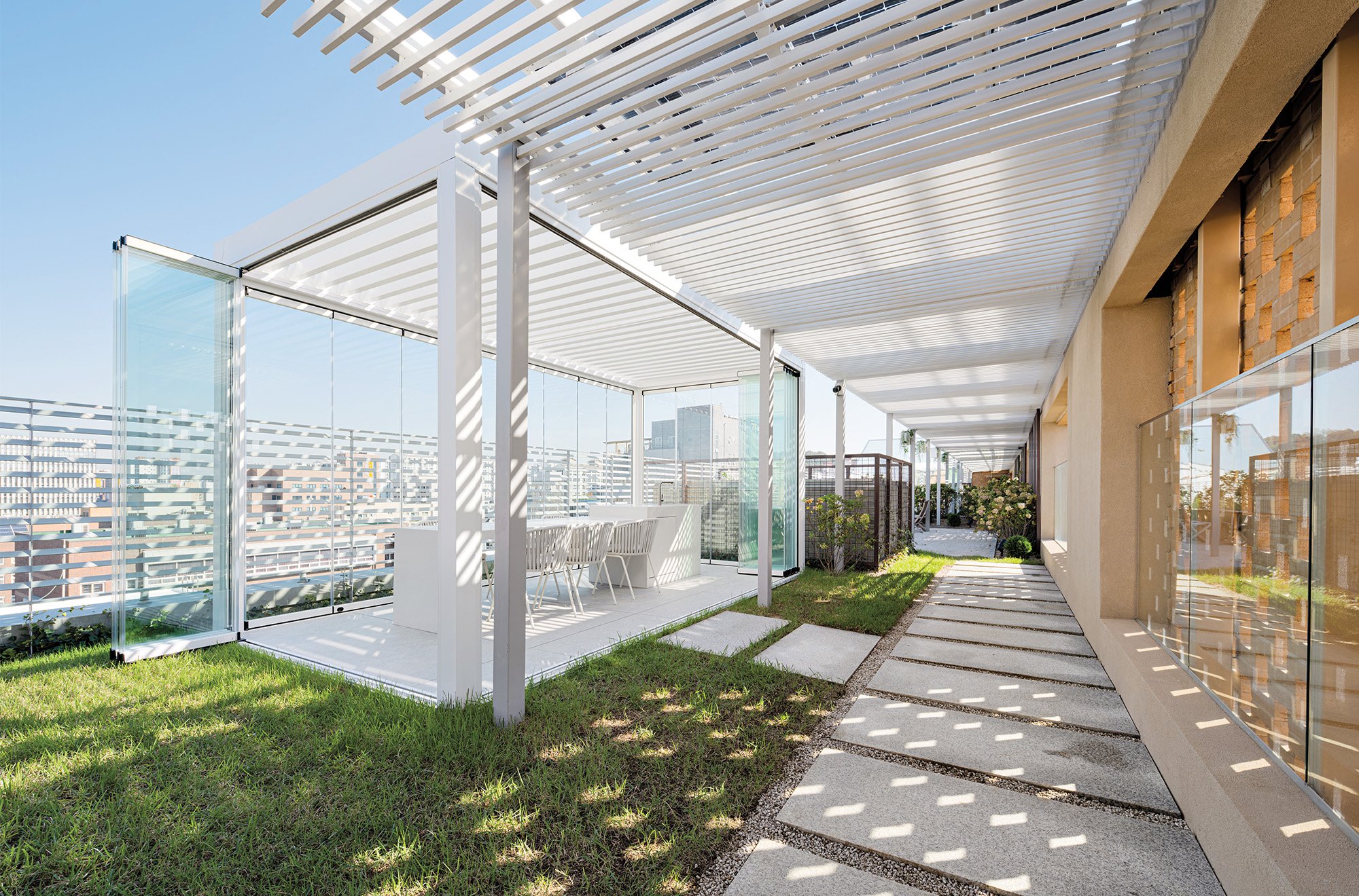 The building is topped by a garden for outdoor rest and relaxation in the dense urban environment. Louvered shading devices keep the rooftop cool, while providing a support structure for a solar array that helps the facilities meet Korea’s Green Building Certification System regulations.