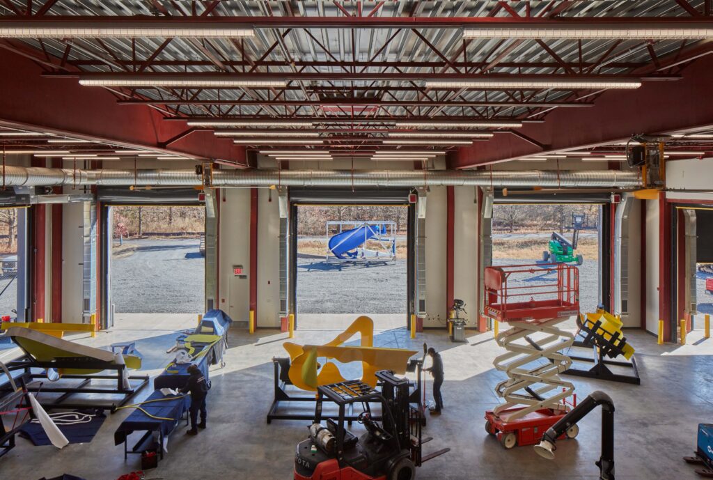 The building, which is over 19,000-square-feet, is housed within a high-performance insulated metal panel enclosure, with the panels bunding sheathing, insulation, and a weather barrier all at once. It contains a 7,200-square-foot workroom that features industrial ventilation and a large paint booth. The trouble, as is visible from a distance, is the vast size of some of Storm King’s pieces. Tal Streeter’s Endless Column, its tallest at 69 feet, is nearly the height of two telephone poles. The paint booth was accordingly designed to remain open. Sculptures can be driven in, painted in halves, and returned bright for your next visit.
