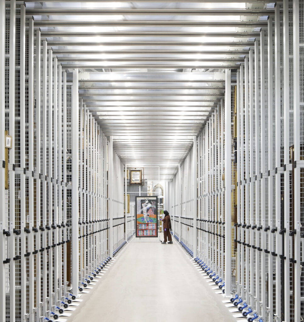 The opportunity arose when the V&A had to evacuate Blythe House, the storage facility it had occupied since the 1980s. Instead of a simple move, it developed a new typology alongside the upcoming V&A East, on the capital’s former Olympic Park. It took over the redundant 172,222 sq. ft. (16,000 m2) Media Centre for the 2012 Games, adapting it with two aims in mind: collections care and unfettered public access.