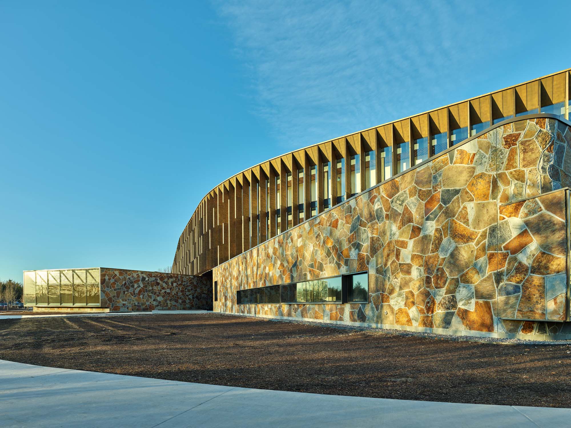 In response, the firm created a meandering building that responds intimately to its Northwest Arkansas setting of forests, bluffs, canyons, caves, and streams—not to mention the holistic vision of the Institute itself. Walking around and through the building feels like a walk in the woods: gentle curves winding through the softly layered site while weathered brass fins—like tall, narrow tree trunks—filter the sunlight in a dappled pattern, casting changing shadows and drawing the outside in. Thick, multicolored fieldstone cladding with wide rope joints reflects the Ozarks’ so-called “Giraffe Houses,” whose surfaces resembles, yes, the skin of a giraffe. A central “dogtrot”—another local reference—provides an open passage through the bridged building itself (the site was partially occupied by a ravine), encouraging curiosity while maintaining flow across the campus.