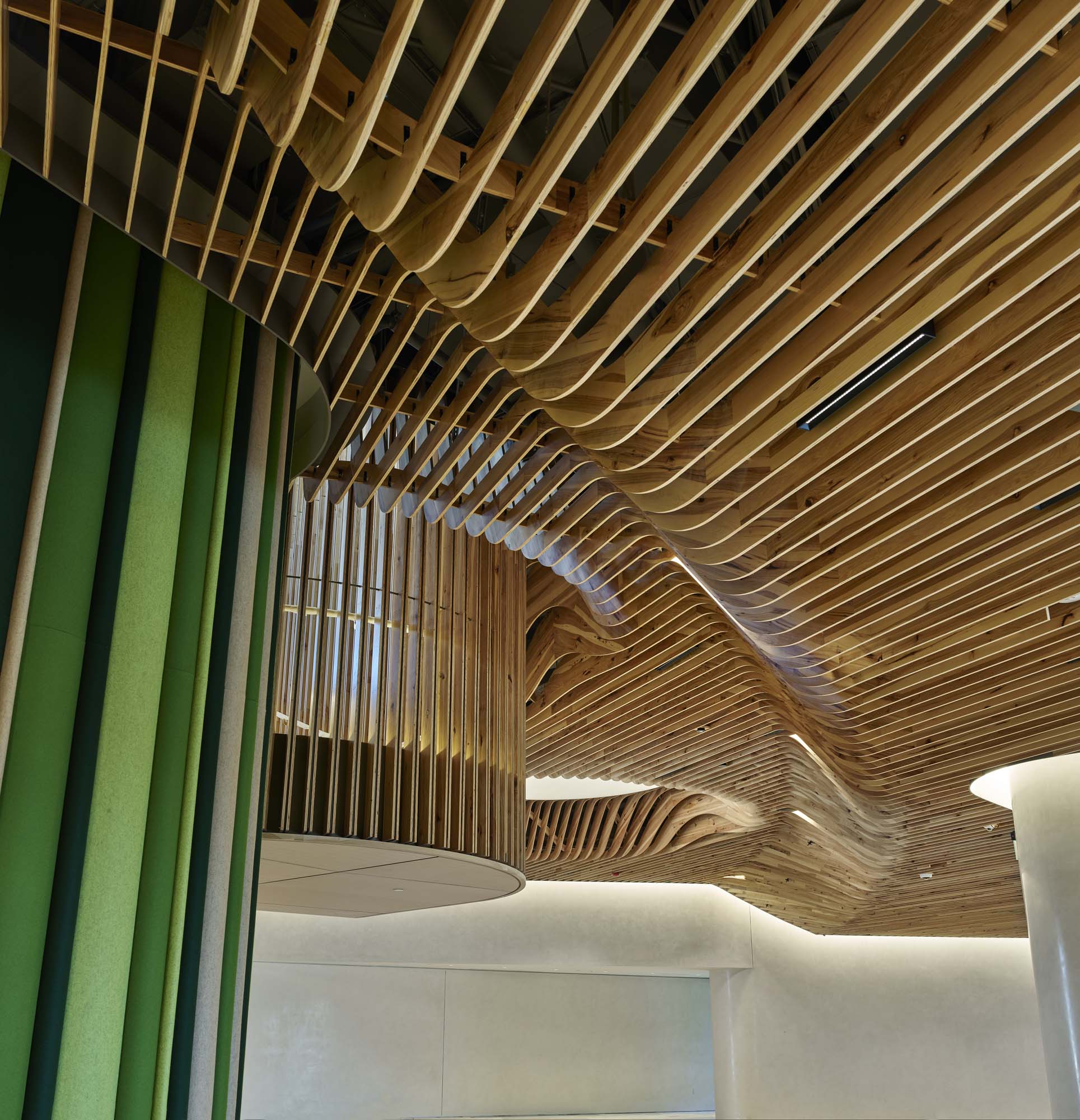 Inside, the building is tactile and immersive. Fluid spaces flow from one to the next, blurring divisions, and drawing visitors along intuitively. “I think people are going to be hypnotized, says Eccleston. “The space is a journey—it’s like a topography.” Curved, CNC-milled pecan wood fins—made from local trees and featuring a marbled mix of light and dark tones—lines ceilings throughout. Walls upholstered in gradient green wool felt evoke the forest canopy while providing acoustic control. Carpeting mimics moss-covered stones—soft underfoot, with earthy greens and browns that emulate the forest floor. Mottled Venetian plaster changes hue with the daylight.