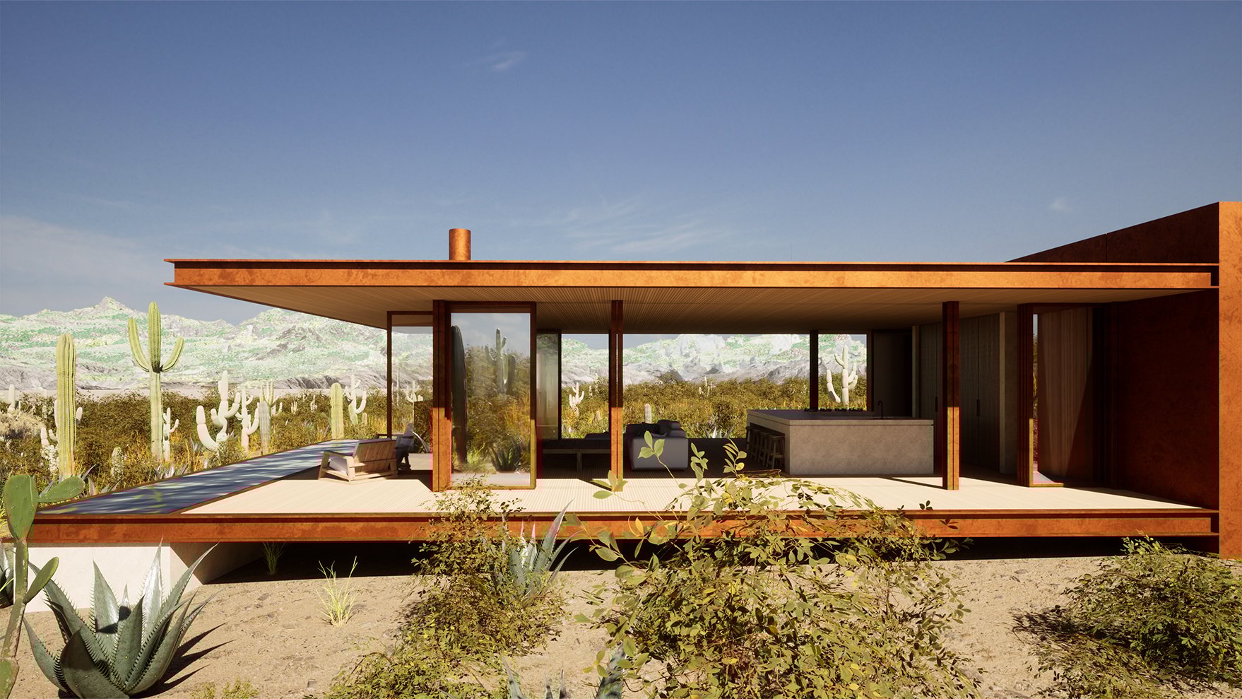 The design’s simple materiality includes abundant glass and Corten steel, complementing its desert backdrop as it weathers into a patina. An extended roofline as well as an external shading system will also deflect heat gain and seal up the structure when vacant.