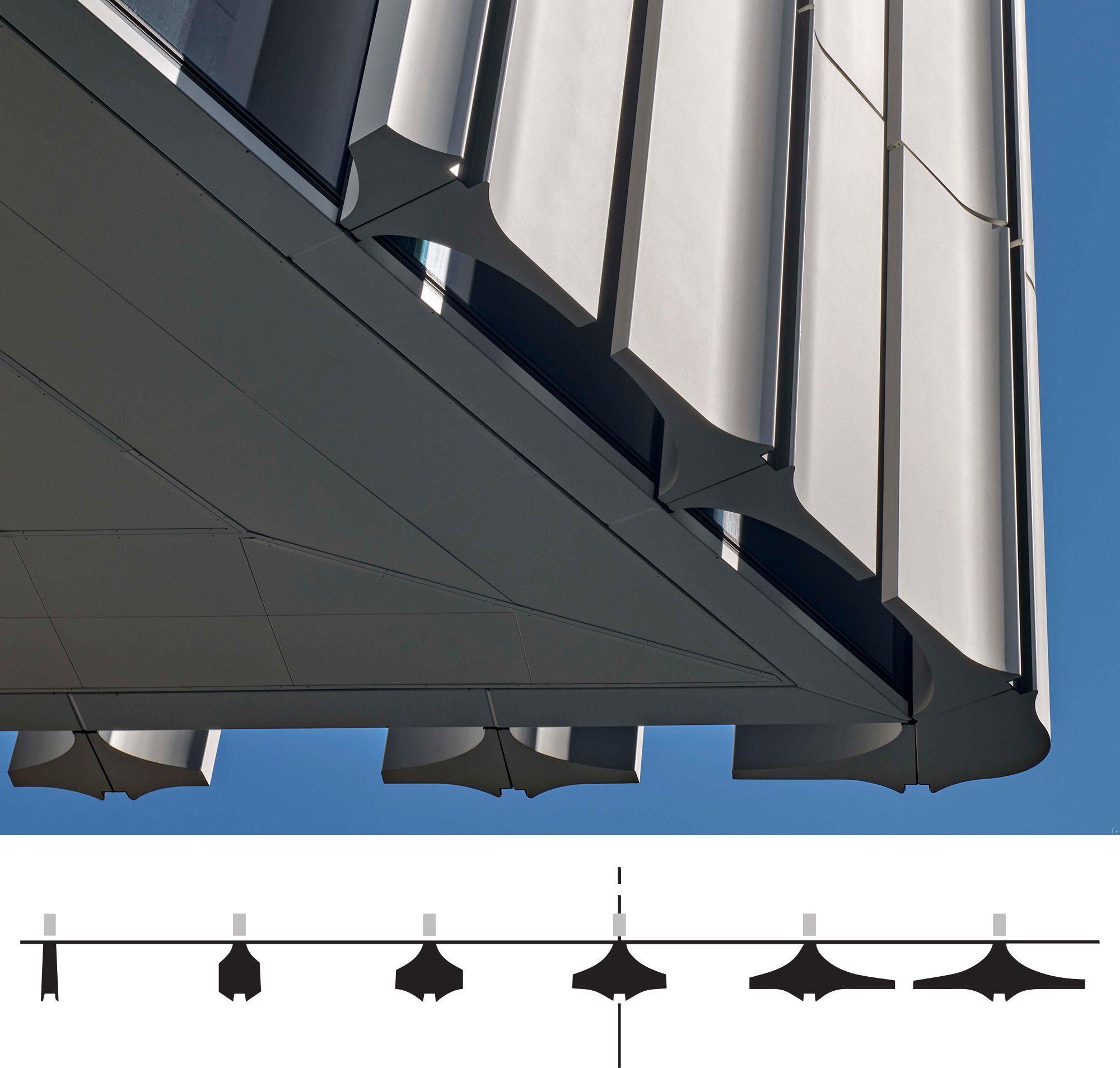 The fluting is achieved with 12 aluminum profile modules arranged variously over a triple-glazed curtain wall. The flutes are also not merely decorative; their patterning is a product of comprehensive solar studies, and the gradation patterns are both informed and related to the spatial arrangement of each floor plate. They also integrate ventilating grilles for the substantial mechanical systems where the air handlers are concealed within a roof-level well.
