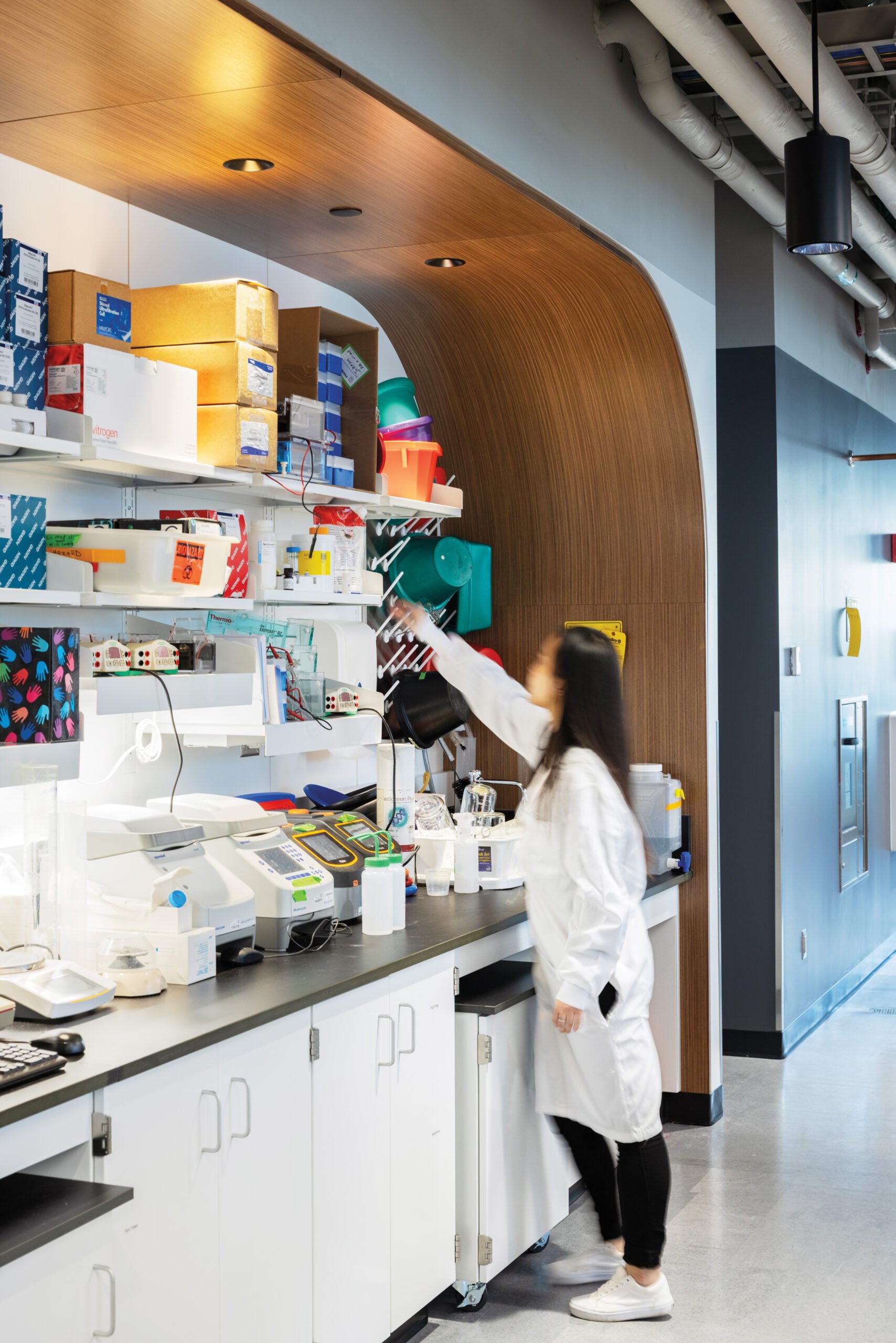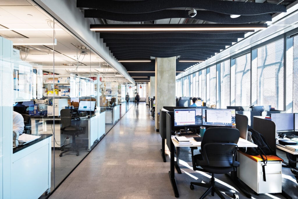 The floors employ a programmatic strategy known as risk-based zoning, in which each floor plate forms its own unified research environment with a once-through air system, rather than relying on traditional wet and dry lab classifications.