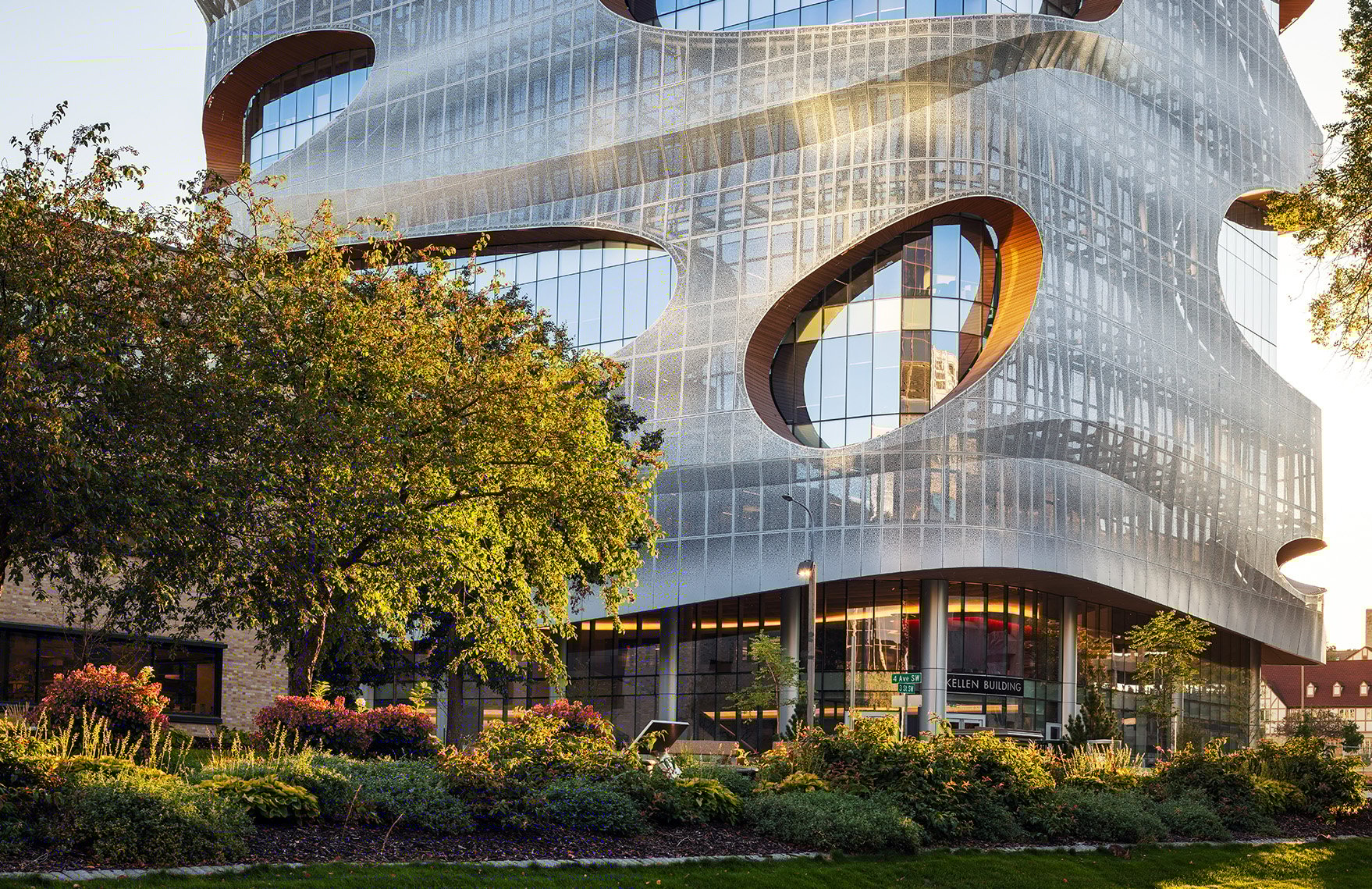 The building holds the southwestern edge of the research district, with an undulating, high-profile facade rising 11 stories in curtain wall glazing and aluminum scrim. Featuring a perforation pattern inspired by a tessellation of Mayo Clinic’s three-shield logo, the double-layered facade opens the interiors to light and views, while reducing mechanical loads through strategic shading.