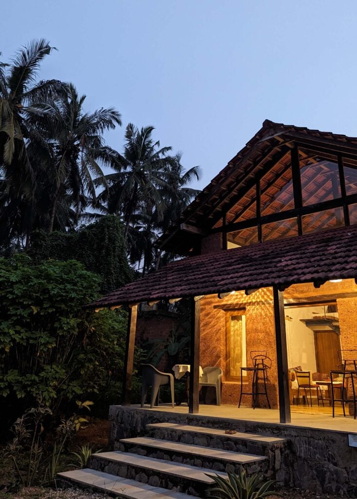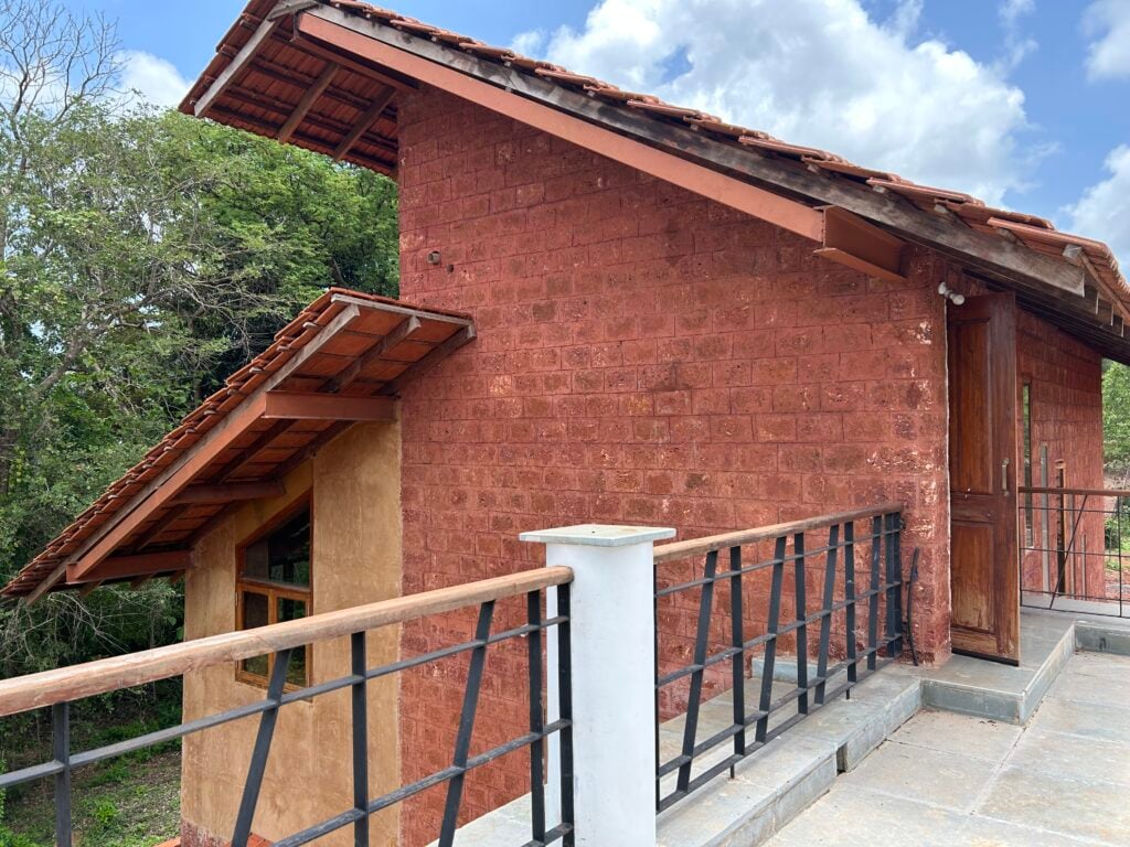 D’Silva harvests her palette from the ground itself. To her, material is never a moodboard—it’s an ethical and ecological imperative. To build a home in Panjim, she used reddish laterite that was quarried meters from the build site. By cutting it parallel to its natural grain, she revealed porous textures that allow the material to breathe and cool interior spaces through humid summers. A coconut tree, too venerable to fell, becomes the house’s structural pivot—its fronds forming a living canopy. There is no false ceiling or mechanical cooling: linear arched vaults made of brick support a load-bearing structure, deep overhangs redirect sun, and sloped roofs channel monsoon torrents into recharge pits.