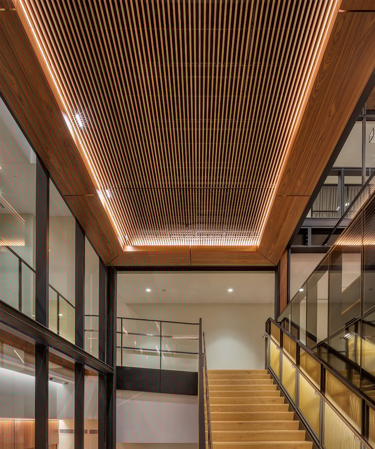 Across 178,000 square feet, a palette of natural materials yields sumptuous, sun-drenched interiors. Drop ceilings and flooring were reused, while low-carbon carpet and chipboard complement the airy space. Alongside collaboration spaces and versatile nooks, “serenity rooms” offer employees reprieve through meditative bonding with plants. The plentiful greenery underscores a 34 percent reduction in embodied carbon—the equivalent of planting 24,000 trees and nurturing them for a full decade. The LEED Platinum design reduces water use by 40 percent and energy consumption by 20 percent as well.
