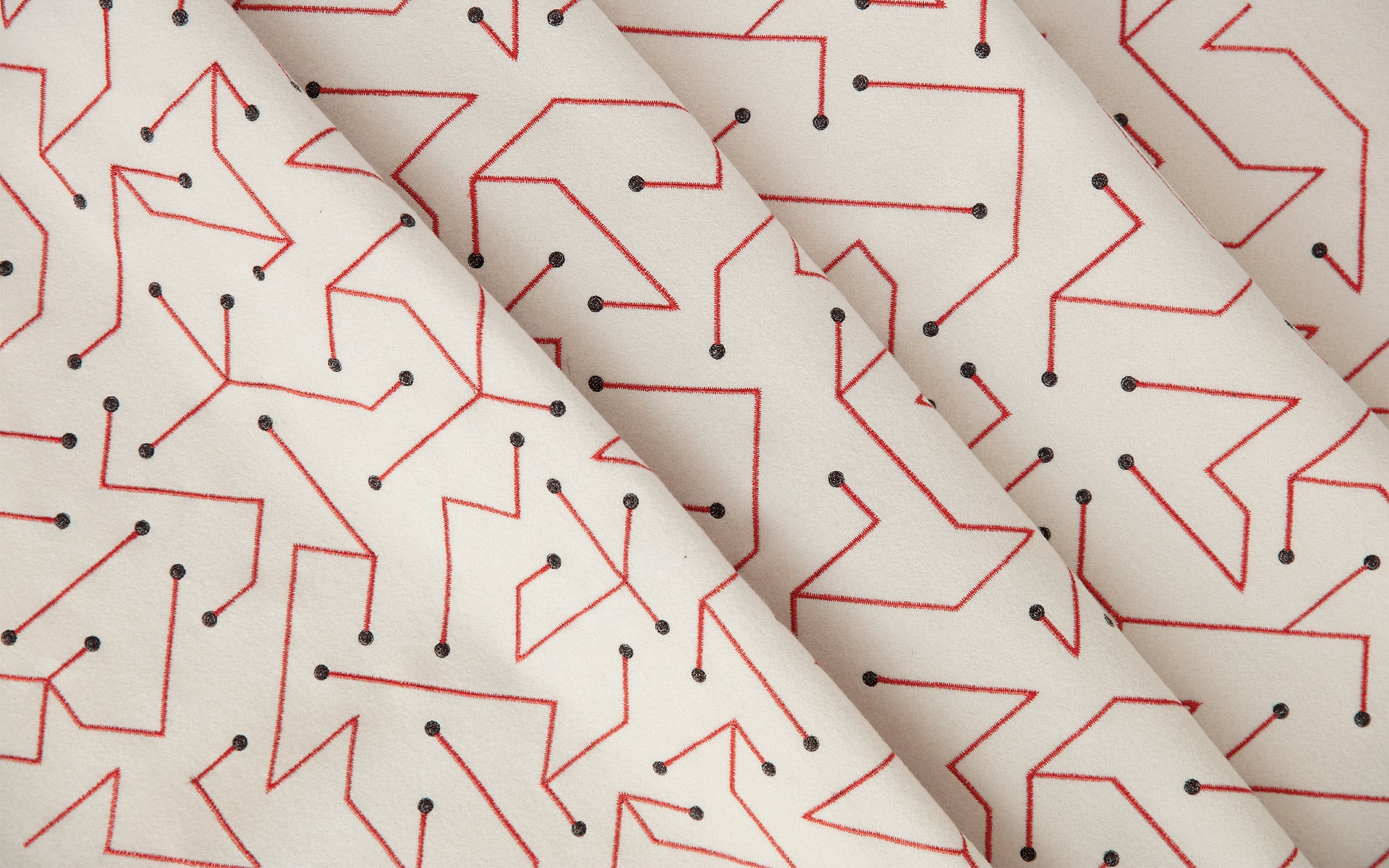 Transistors is based on a 1957 marker drawing by legendary designer Alexander Girard in which he explores his fascination with intricate mechanisms. In it, an embroidered pattern features a circuit-like design, with short lines articulated by round dots spanning across a felted wool ground. Color palettes derive from Girard’s tritone silk-screen studies in combinations of cream, brick, and brown; ocher, silver, and stone; forest, ink and magenta; and cobalt, steel and cherry.