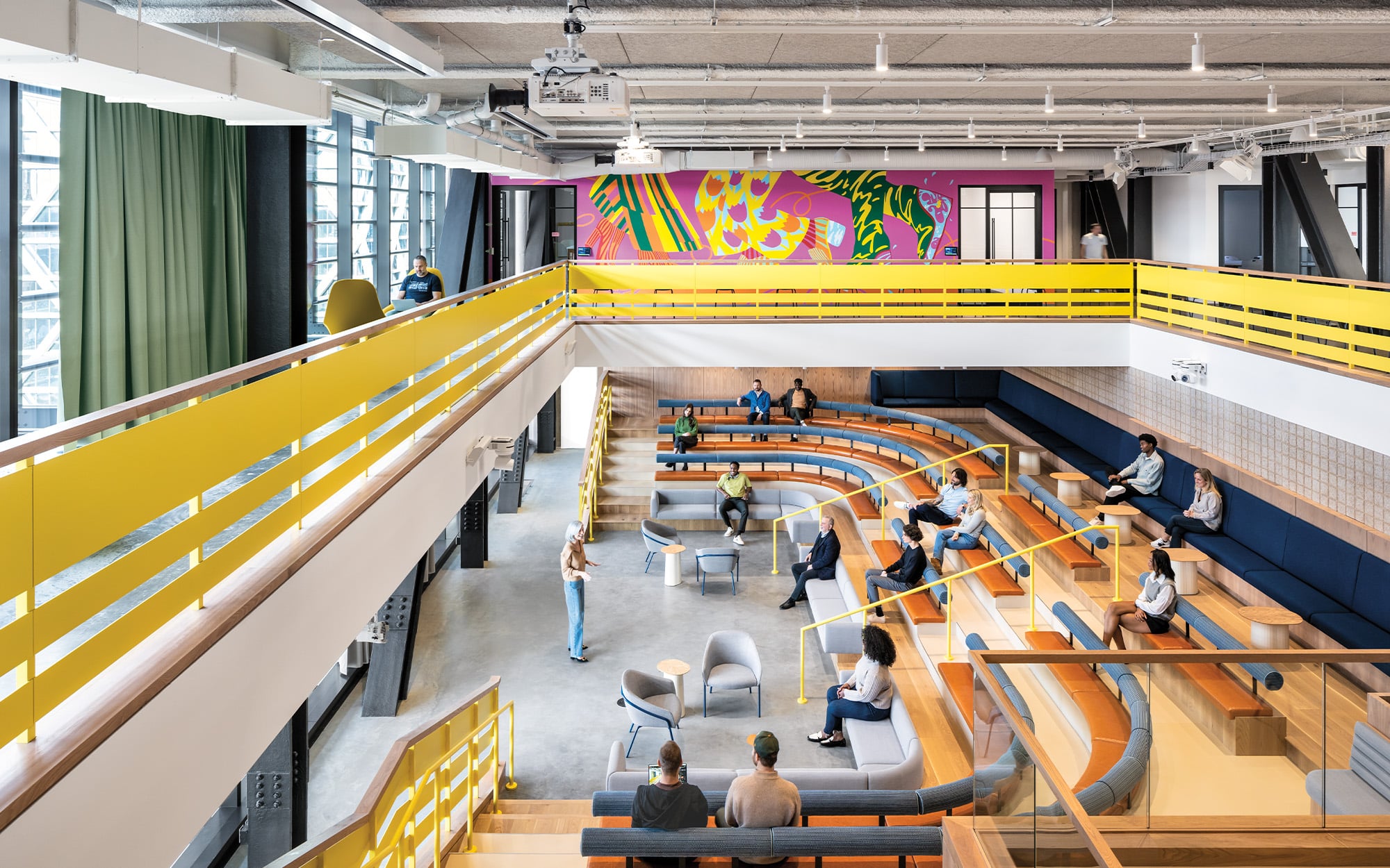 The design teams envisioned each of the nine floors as a “neighborhood,” complete with unique color and brand stories, furniture styles, artwork, and meeting room designs. While levels vary in visual identity, all floors share similar architectural frameworks designed to support different types of work. Private offices and quiet zones like moody libraries support focused tasks. Communal lounges, coffee bars, and maker spaces foster informal collaboration and creativity.