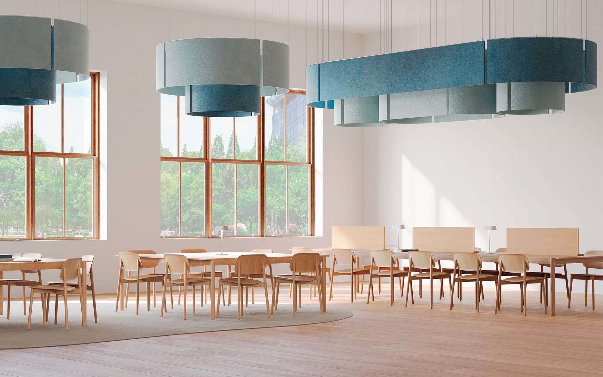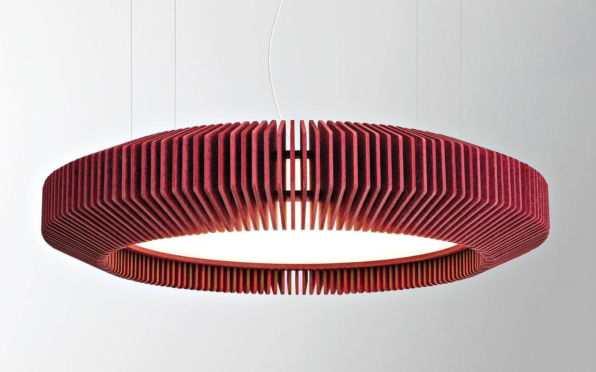 A drum light fixture wrapped in vertical fins, Acoustic Dial delivers noise absorption while making a striking visual impact. Available in multiple sizes, styles, and colors, it’s an instant statement piece appropriate for workplaces, hospitality environments, and education settings. The shades feature nine-millimeter-thick Sola Felt, a PET material manufactured with 50 percent postconsumer recycled content.