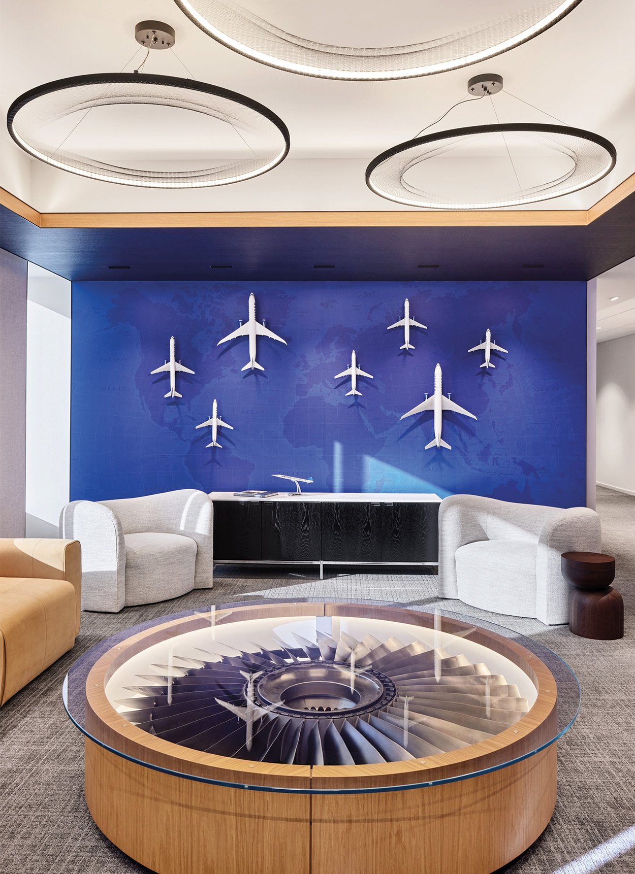 United also looked to resolve its carbon footprint beyond the workplace by integrating out-of-service airplane parts. The most notable appearances include engine-inspired light fixtures, a turbine coffee table, and a winglet room divider. Playful artwork composed of seatbelts and runway batons brings character to a project distilled by Gardner in a succinct phrase: “Keeping materials simple optimizes future reuse.”