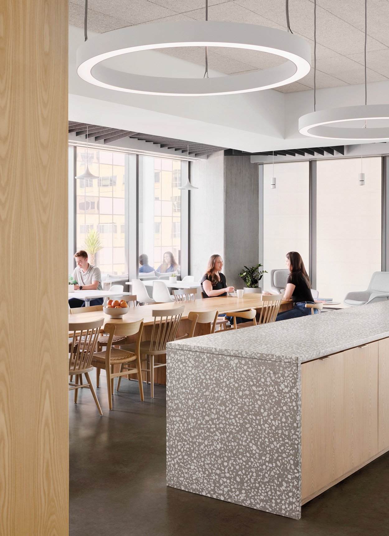 In the new office, textural concrete ensconces a mix of open studios, quiet zones, private meeting rooms, and communal hubs. Biobased or reused ceiling panels and recycled carpeting dampen noise, as do the renewable felt wall panels. Homasote wraps the exterior of collaboration pods to double as a seamless pinup surface while also absorbing sound. Other highlights of the sustainable materiality include locally fabricated terrazzo countertops and the circulating staircase composed of sustainably harvested wood. Page also opted to redeem some of its existing furniture, reupholstered in sustainable leather. “If you were moving your house, you would not want to throw away the whole piece of furniture, because it means something to you,” says Page associate Julien Brown. “That mindset actually is very important to the principles of sustainability and reuse.”