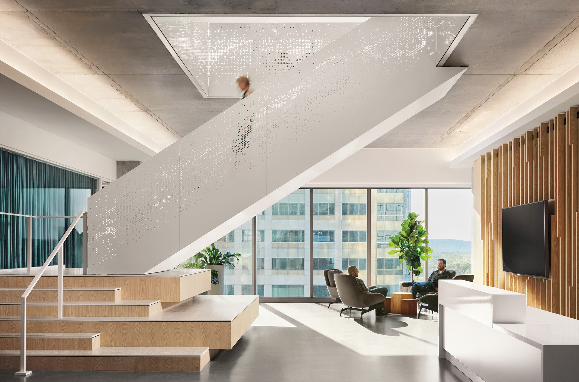 After more than 20 years at its original Austin address, the architecture firm Page was long overdue for a fresh start. So, when space opened up in a local building from its own portfolio, the firm leveraged its intimate knowledge of the building systems to craft an interior that complemented the LEED Platinum tower. “We knew how sustainability was embedded into the design core and shell. We knew how water was reclaimed, about the green space that was adjacent, about the terraces,” says Wendy Dunnam Tita, Page’s chief practice officer and commercial & mixed-use sector leader.