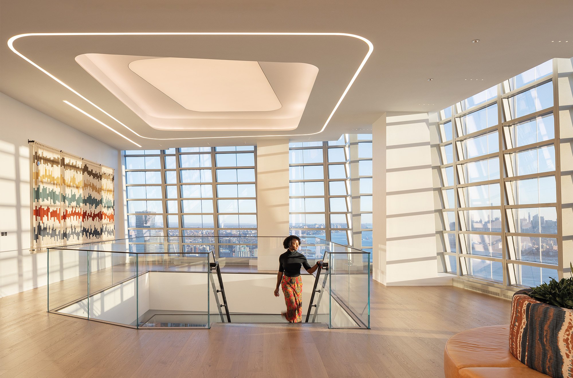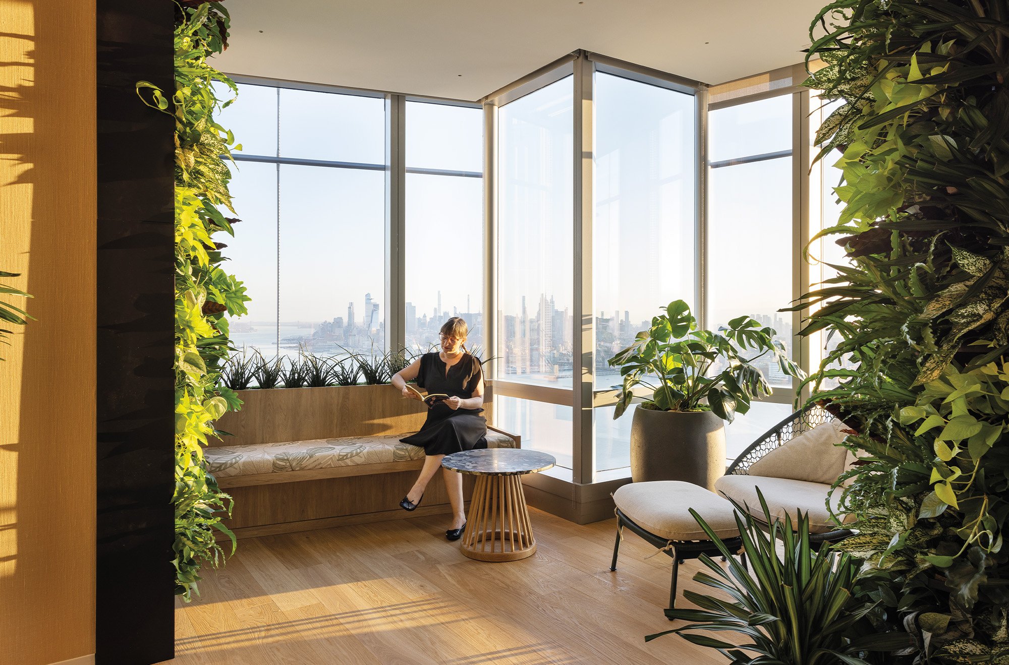 The investment management firm Lord Abbett tapped HLW to realize a modern workplace inside the Goldman Sachs Tower in Jersey City, New Jersey, centered on wellness and transparency. With support from sustainability consultancy BEYOND, the firm conceived of a biophilic office design predicated on circadian lighting, air quality, and employee comfort that is already paying dividends. “We also had a really big focus on decarbonization, especially focused on embodied carbon,” says HLW principal and global director of sustainability and wellness Jonce Walker. “The original target was ten percent reduction, and we’re trending to thirty to thirty-five percent, which is pretty high for a project like this.”