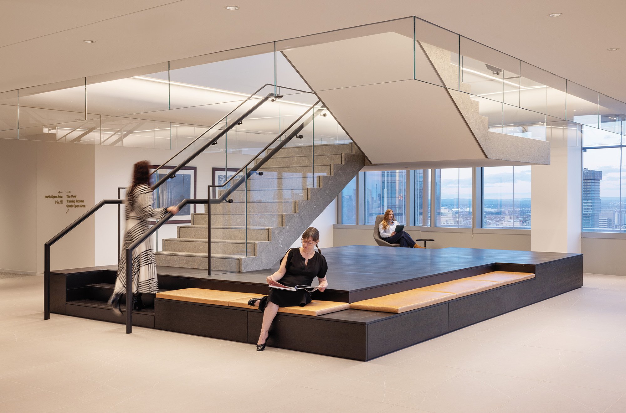 HLW’s space planning also reduced Lord Abbett’s dependence on artificial lighting, with 60 percent of regularly occupied spaces enjoying natural illumination. Accessed via the prime staircase, an upper level amenities suite beckons with even more daylight and a backdrop of sprawling vistas. “It ties back to Lord Abbett’s goals,” says Melissa Strickland, HLW principal and managing director, “and what they wanted to give to their employees.”