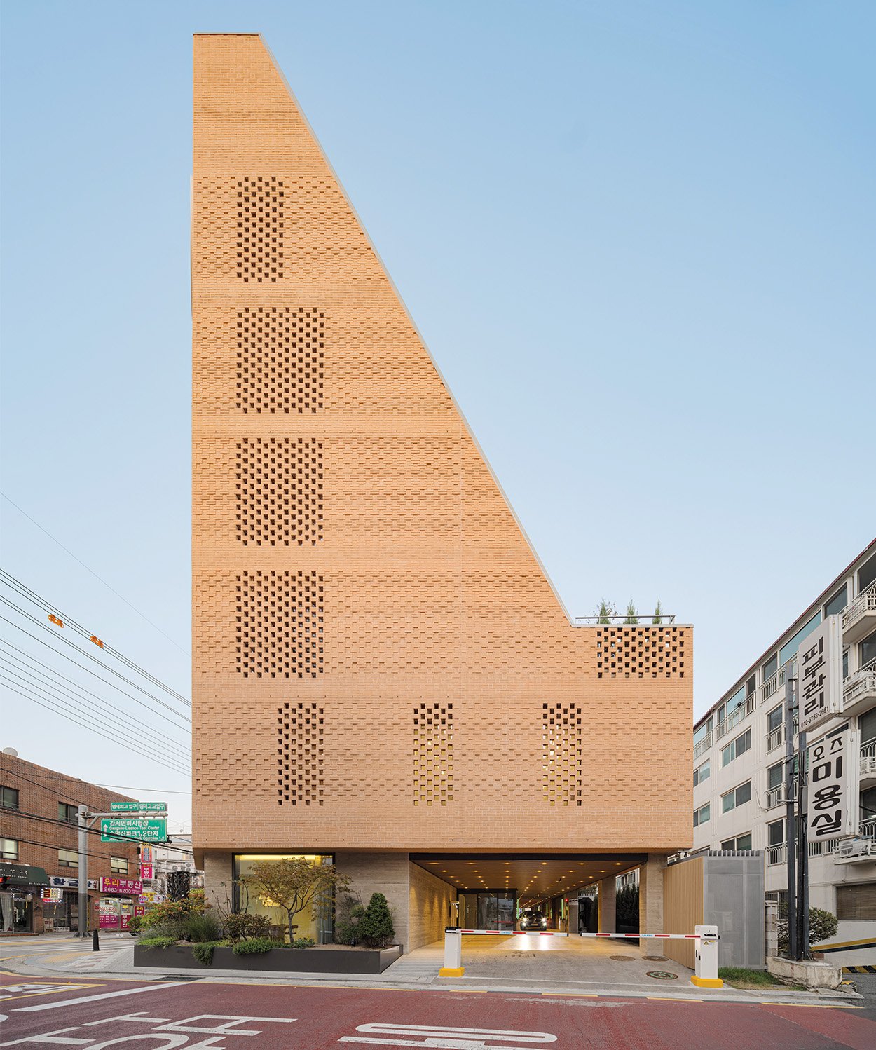 Yeonhan Architects selected a salmon-colored brick to clad the building as a reference to the neighborhood’s residential architecture. A combination of protruding and recessed brick techniques creates a patterned screen that provides both visual interest on the exterior and creates the dappled light and shadow on the interior.