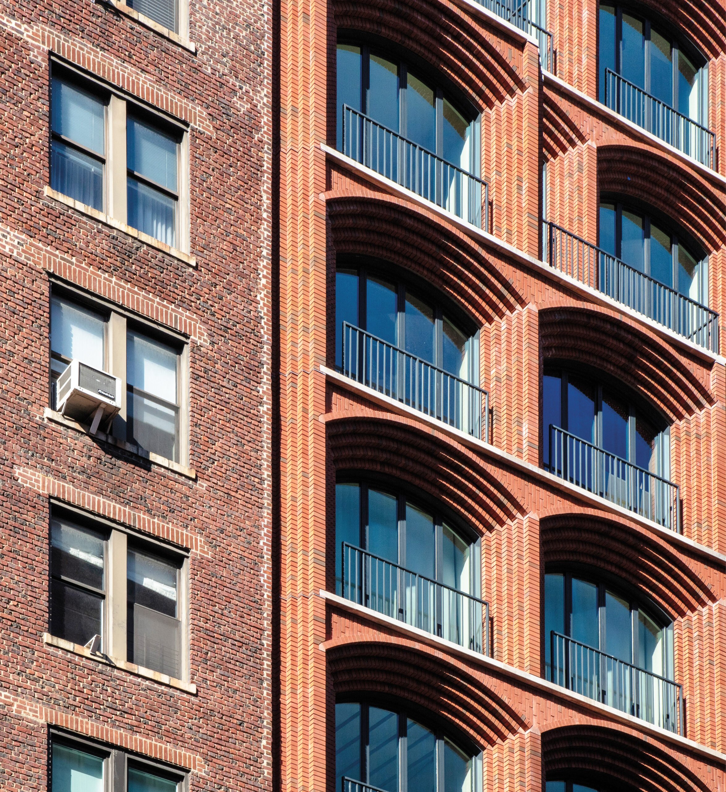 “The client said, ‘I want you to focus on a module, do it really well, do it a number of times, but design it once and perfect it,’” Klemperer remembers. After multiple iterations and working with builders and material suppliers, the design team landed on a pressed-in archway module with five layers that add depth between the exterior of the windows and the facade’s edge. Klemperer calls these arched bays “echeloned.” Beyond introducing a dynamic interplay of light and shadow as the sun hits different parts of the arches throughout the day, the deep arches give occupants a subtle sense of shelter and shade (depending on the time of day) from their wrought-iron Juliet balconies.