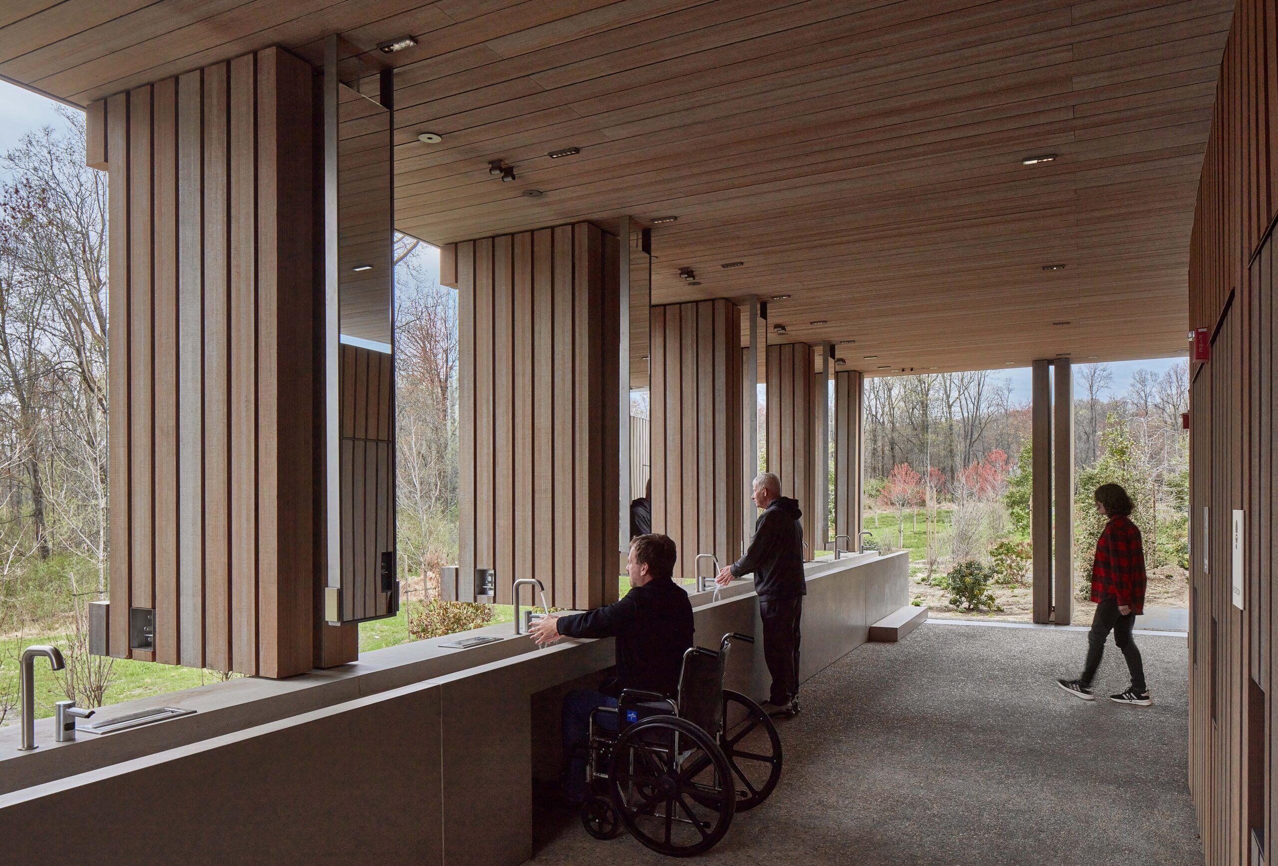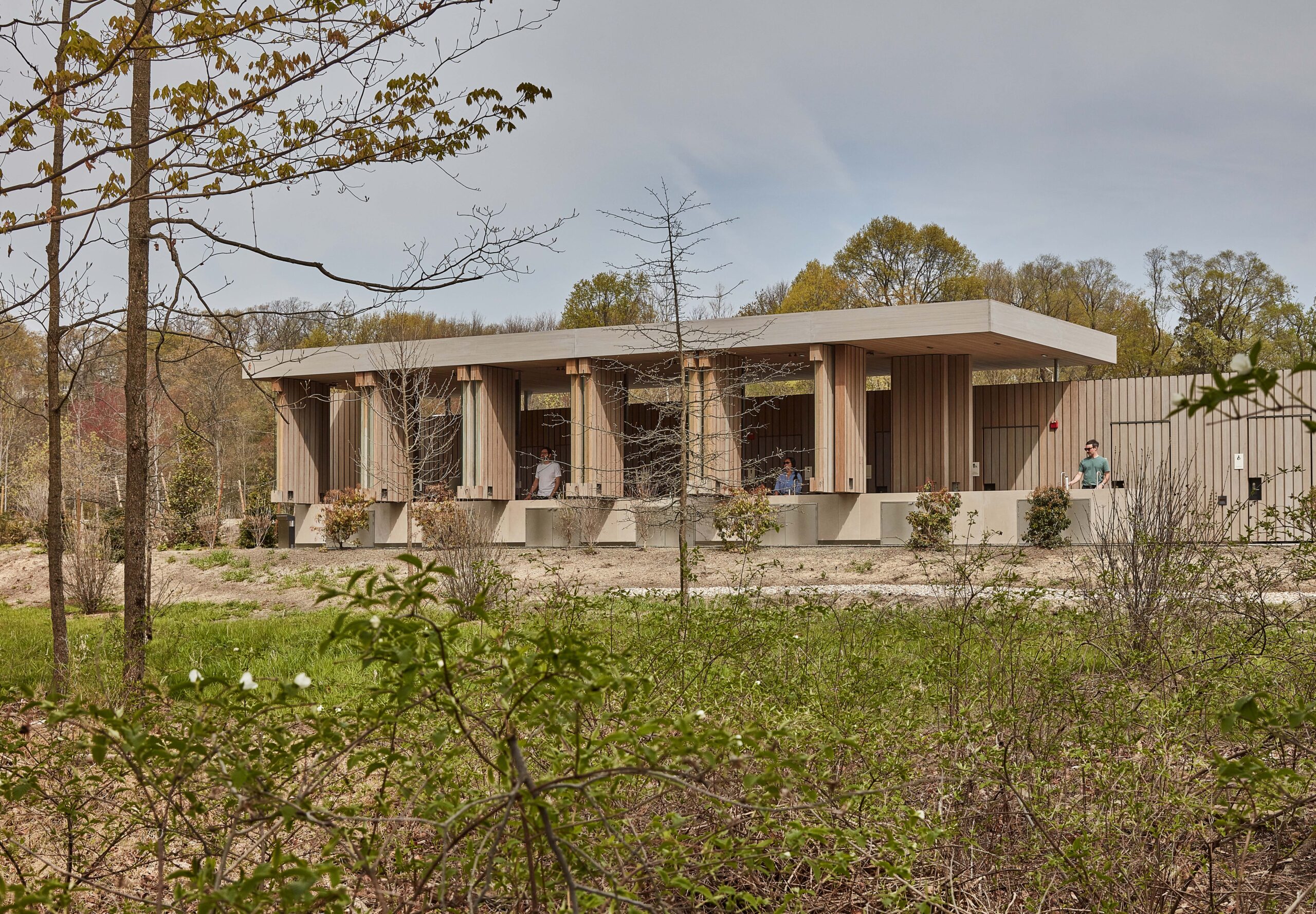 The understated but sharp pavilions consist of Abodo (a thermally modified pine) cladding and concrete that contains native stone aggregate. The restroom pavilion is also permeable, featuring a corridor lined with operable shutters designed to provide open air during much of the operating season.