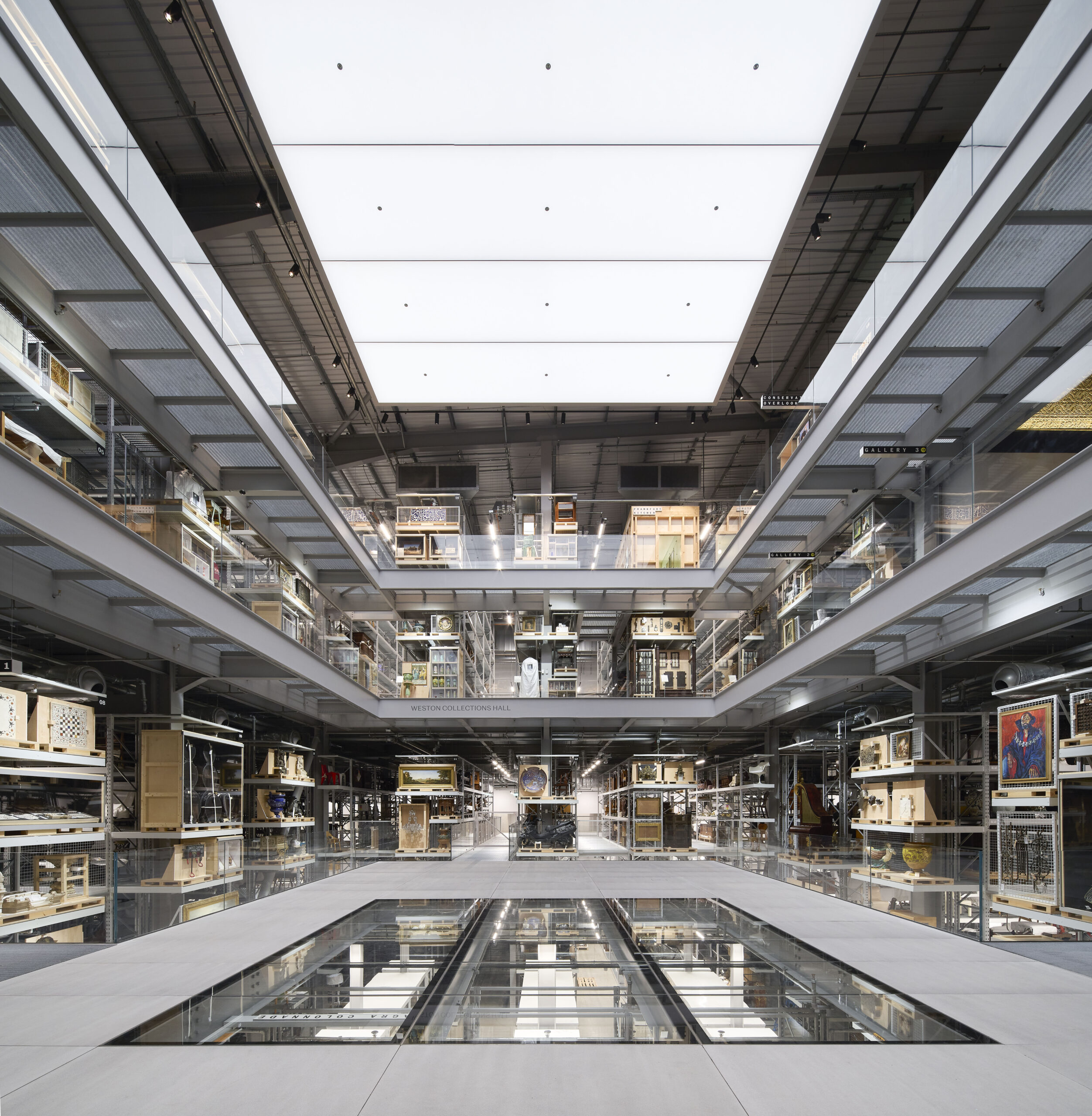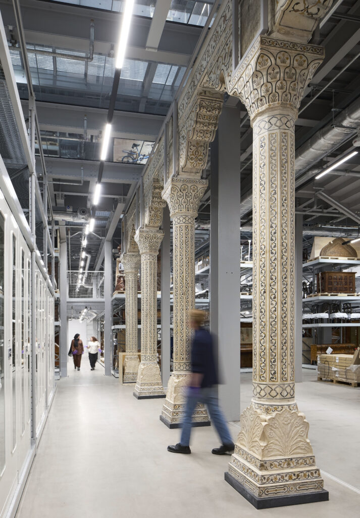 The opportunity arose when the V&A had to evacuate Blythe House, the storage facility it had occupied since the 1980s. Instead of a simple move, it developed a new typology alongside the upcoming V&A East, on the capital’s former Olympic Park. It took over the redundant 172,222 sq. ft. (16,000 m2) Media Centre for the 2012 Games, adapting it with two aims in mind: collections care and unfettered public access.
