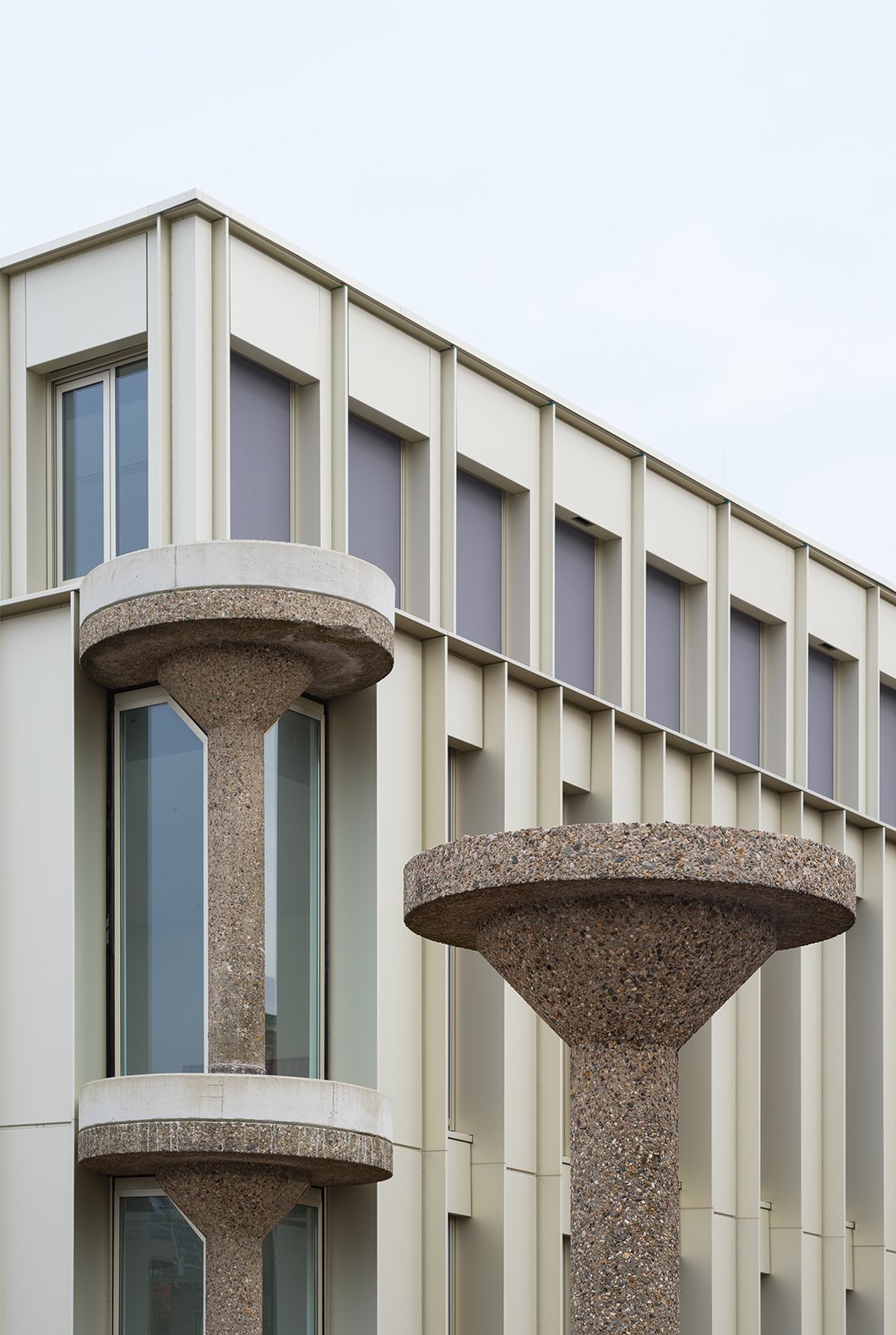 As a listed building within a protected campus, Herta Mohr has a facade on which changes were kept minimal, preserving striking features like its prefabricated concrete columns with conical capitals and round balconies, now fully visible in the renovated structure.