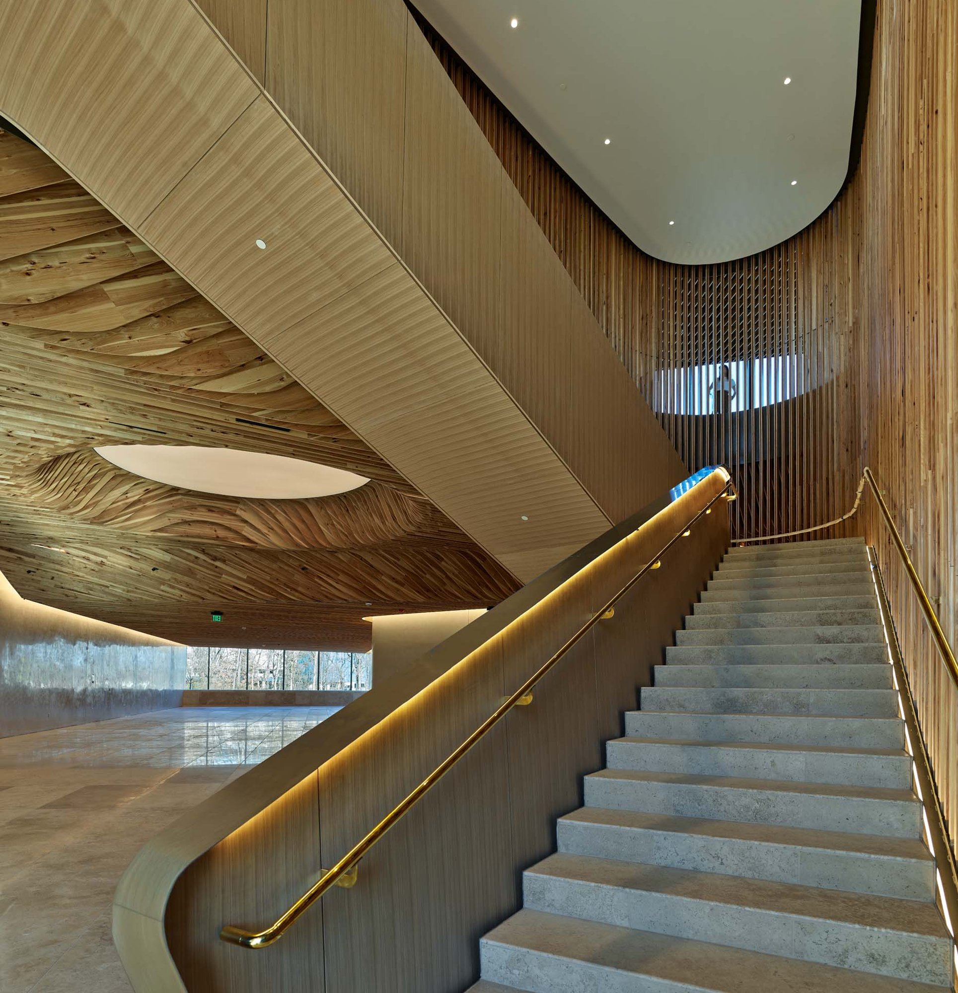 Inside, the building is tactile and immersive. Fluid spaces flow from one to the next, blurring divisions, and drawing visitors along intuitively. “I think people are going to be hypnotized, says Eccleston. “The space is a journey—it’s like a topography.” Curved, CNC-milled pecan wood fins—made from local trees and featuring a marbled mix of light and dark tones—lines ceilings throughout. Walls upholstered in gradient green wool felt evoke the forest canopy while providing acoustic control. Carpeting mimics moss-covered stones—soft underfoot, with earthy greens and browns that emulate the forest floor. Mottled Venetian plaster changes hue with the daylight.