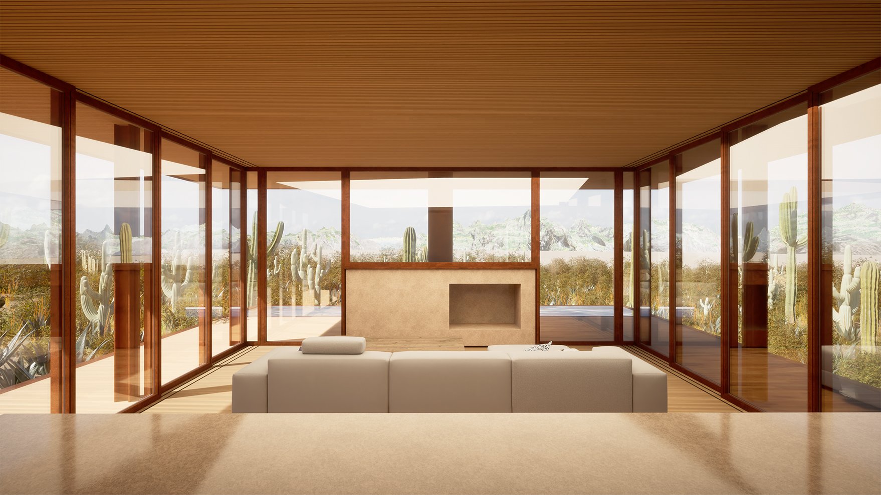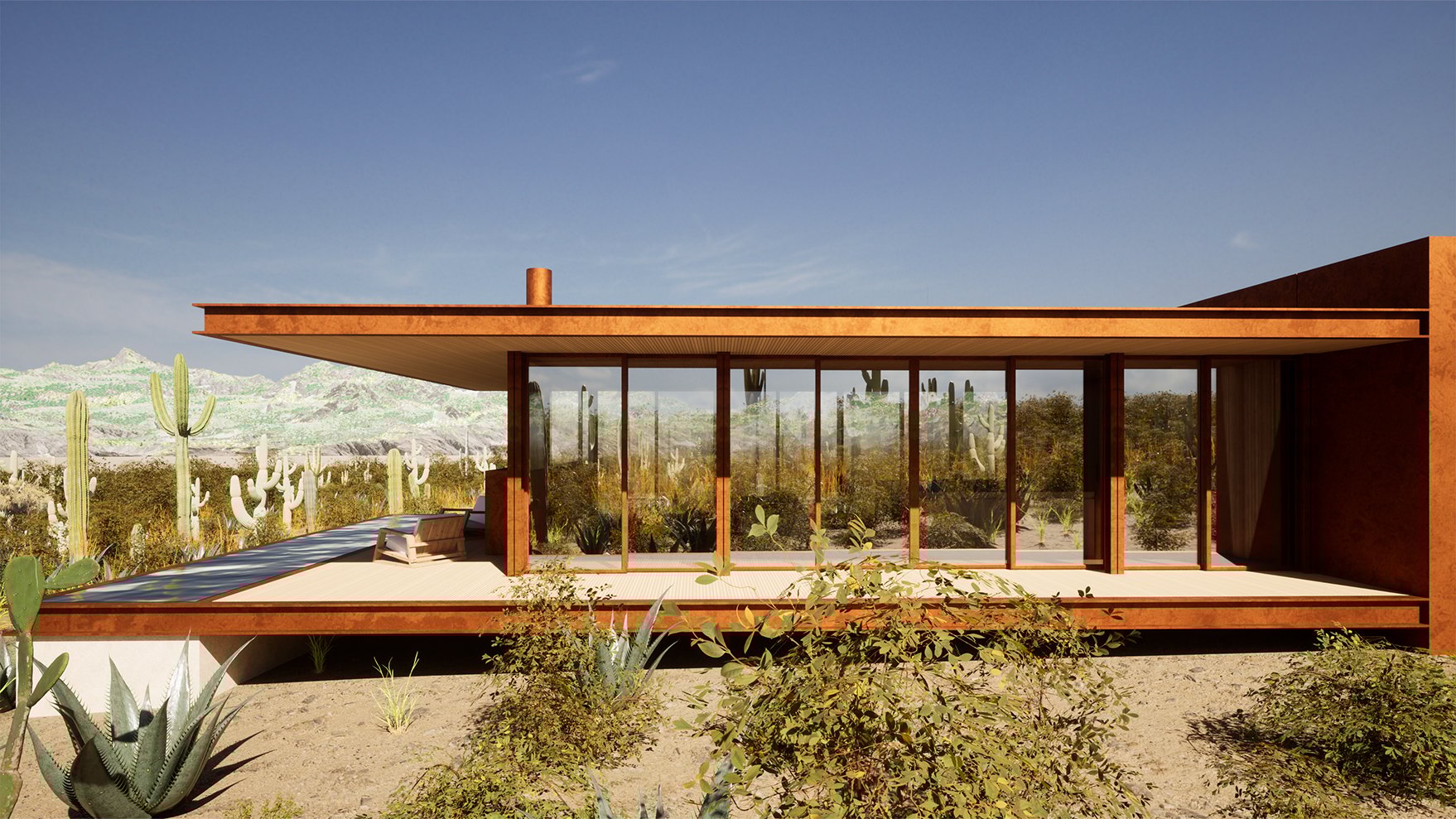 The design’s simple materiality includes abundant glass and Corten steel, complementing its desert backdrop as it weathers into a patina. An extended roofline as well as an external shading system will also deflect heat gain and seal up the structure when vacant.