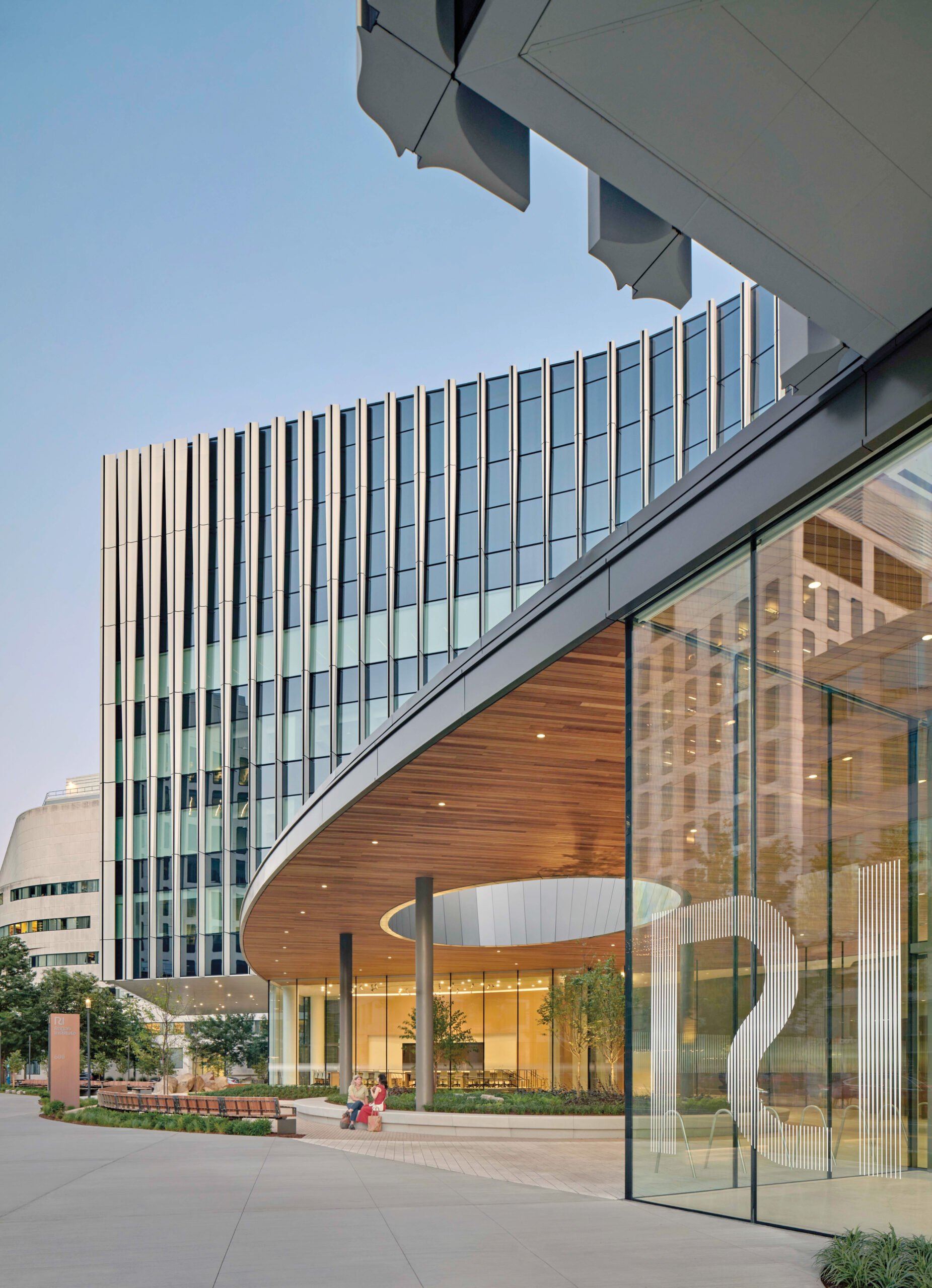 Though the fluted facade detailing of its headquarters nods to the neoclassical vernacular of other notable medical buildings of its institutional partners, Ragon does not feel overly monumental. The V-shaped primary volume occupies its tricky corner lot comfortably, with a triptych of orthogonal elevations designed to match the heights of directly adjacent neighbors.