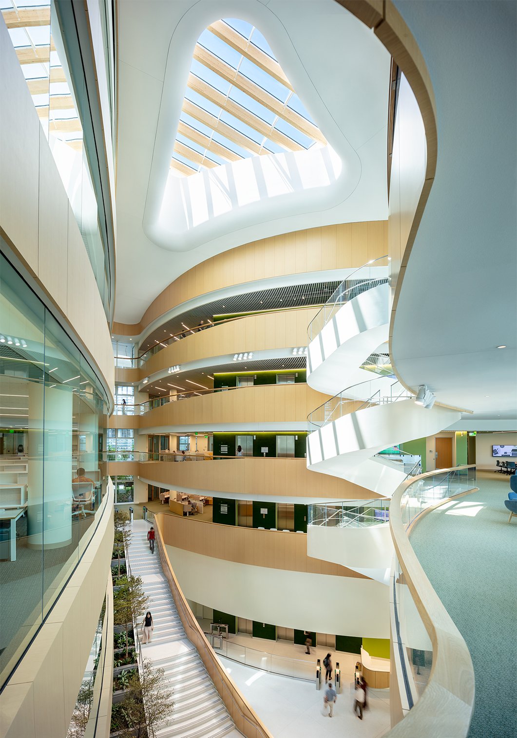 That public-facing character extends from the landscape into the first floor of the building, with seminar rooms of varying sizes, reception area, and childcare facilities—in addition to loading and trial patient intake, which are adjacent but accessed by separate entrances. These auxiliary spaces support the institution’s staff (on-site childcare in particular makes a life-changing impact for scientist-parents grappling with the profession’s unpredictable extended hours in the lab), but they also host community functions and public events during off-hours. The daycare also maintains open spots for neighborhood families to enroll.