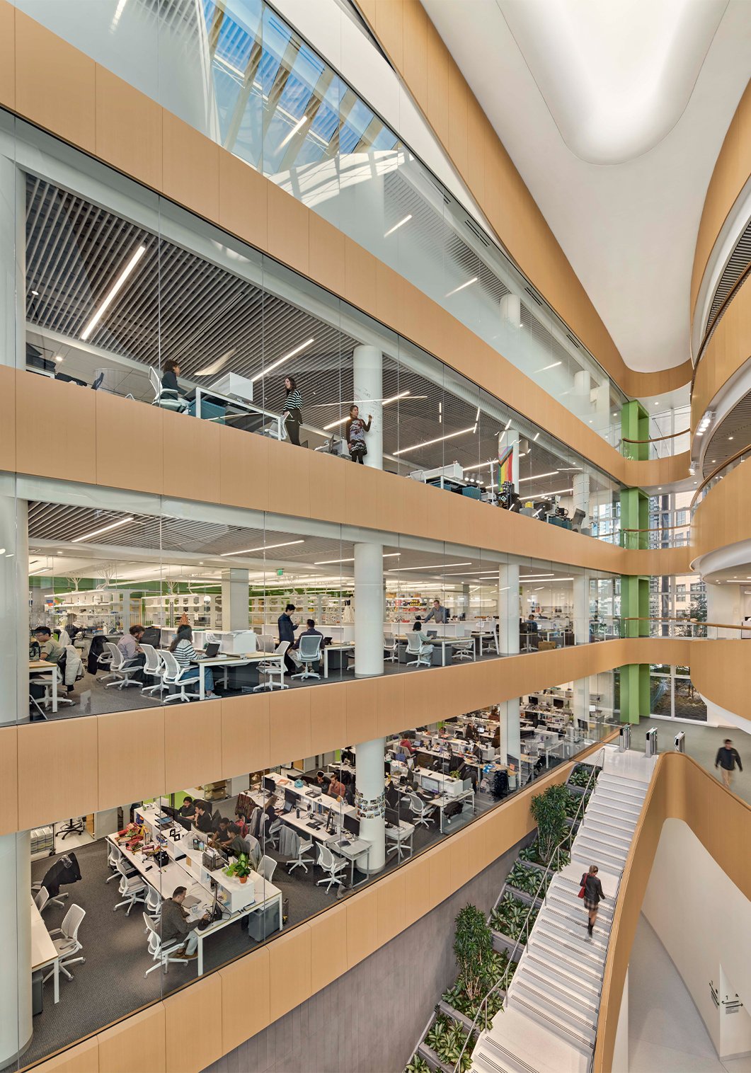The building features sophisticated and compartmentalized mechanical systems for high degrees of air exchange; heroic structural engineering to minimize vibration that would disturb the calibration of sensitive lab instruments; and hygienic material selections. But it is the human-centered, social inflections that shine most brightly as innovation.