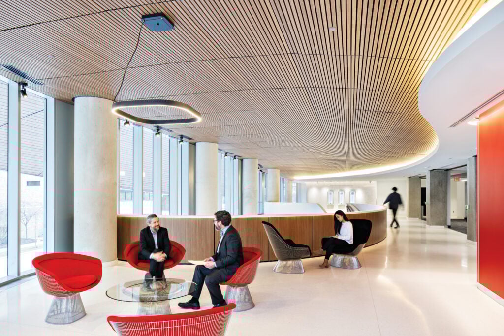 The wavelike scrim filters light into dappled patterns throughout corridors and shared work areas and creates unity across the building’s eight prototypical and three specialty floors, which form a rectangular plan with gently rounded corners.