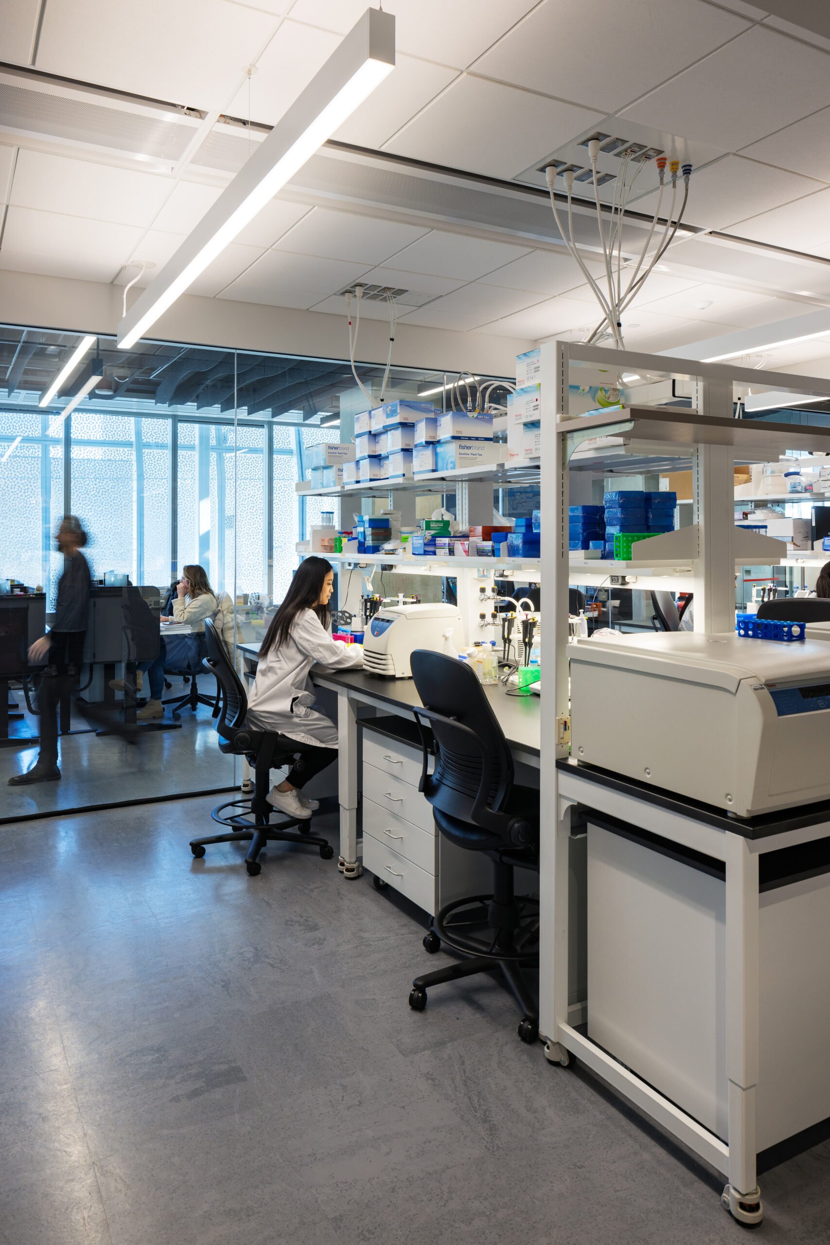 The floors employ a programmatic strategy known as risk-based zoning, in which each floor plate forms its own unified research environment with a once-through air system, rather than relying on traditional wet and dry lab classifications.