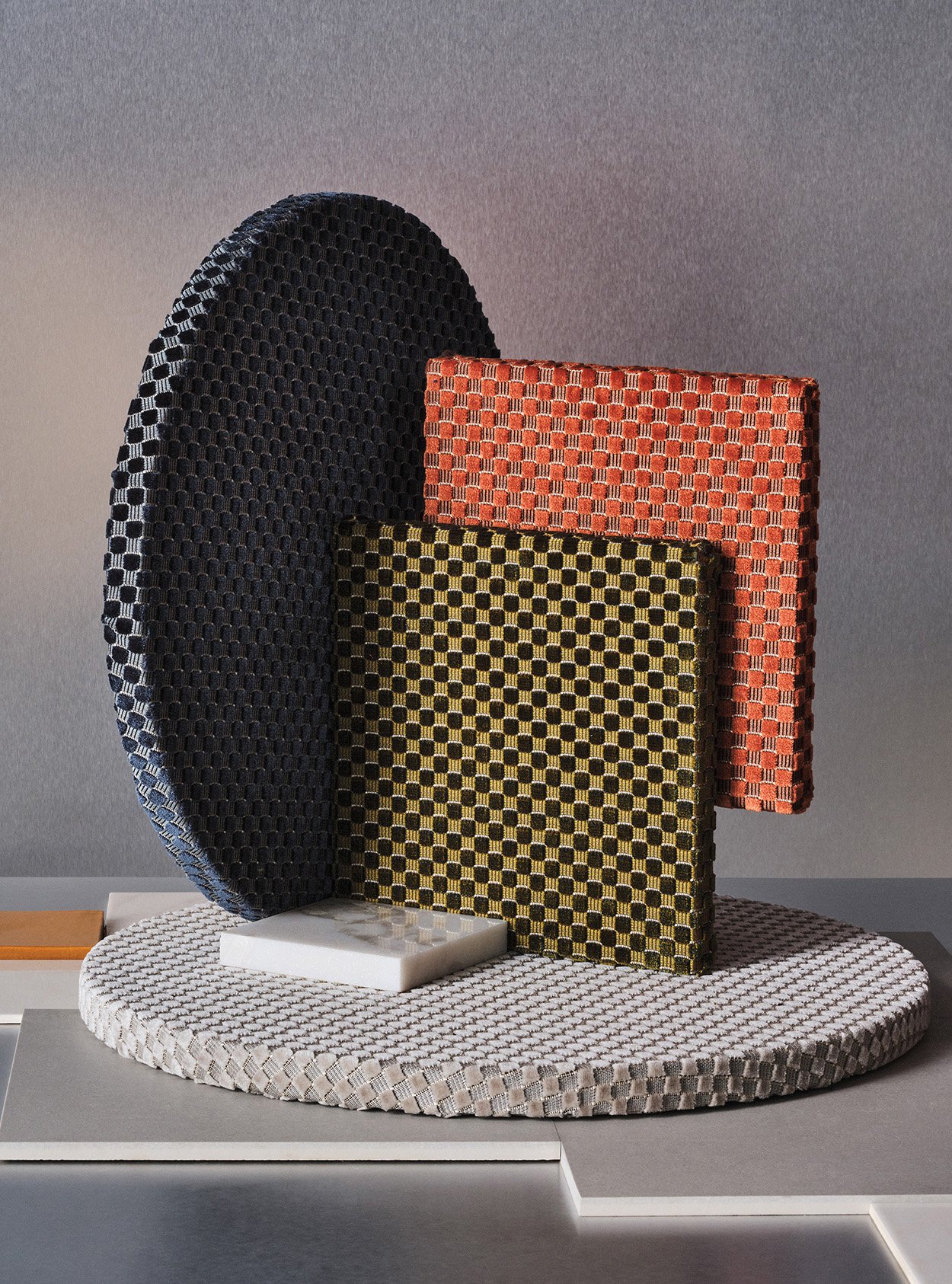 Mark Grattan’s new Layered collection draws inspiration from three aspects of his persona. Creativo, embodying his identity as “the creative,” features a seductive, checkered velvet motif. The textile alternates between cut and uncut surfaces in a rhythm that is both tactile and visually appealing across eight colorways.