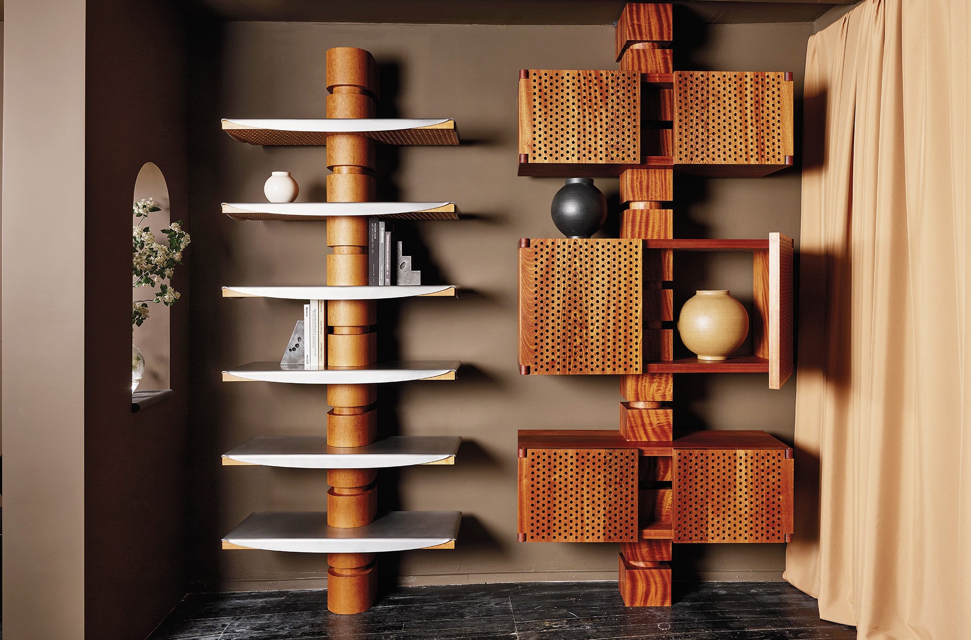 Natalie Shook evolves her sculptural Ledoux Shelving design with a pair of ready-to-order variations tiered to customizable new heights. Rounded, perforated, and draped in aluminum, one version touts a curvilinear bodily presence evocative of midcentury experiments in lightness and transparency. The second presents a square column integrated with simple cabinetry detailed with the same perforated dot pattern.