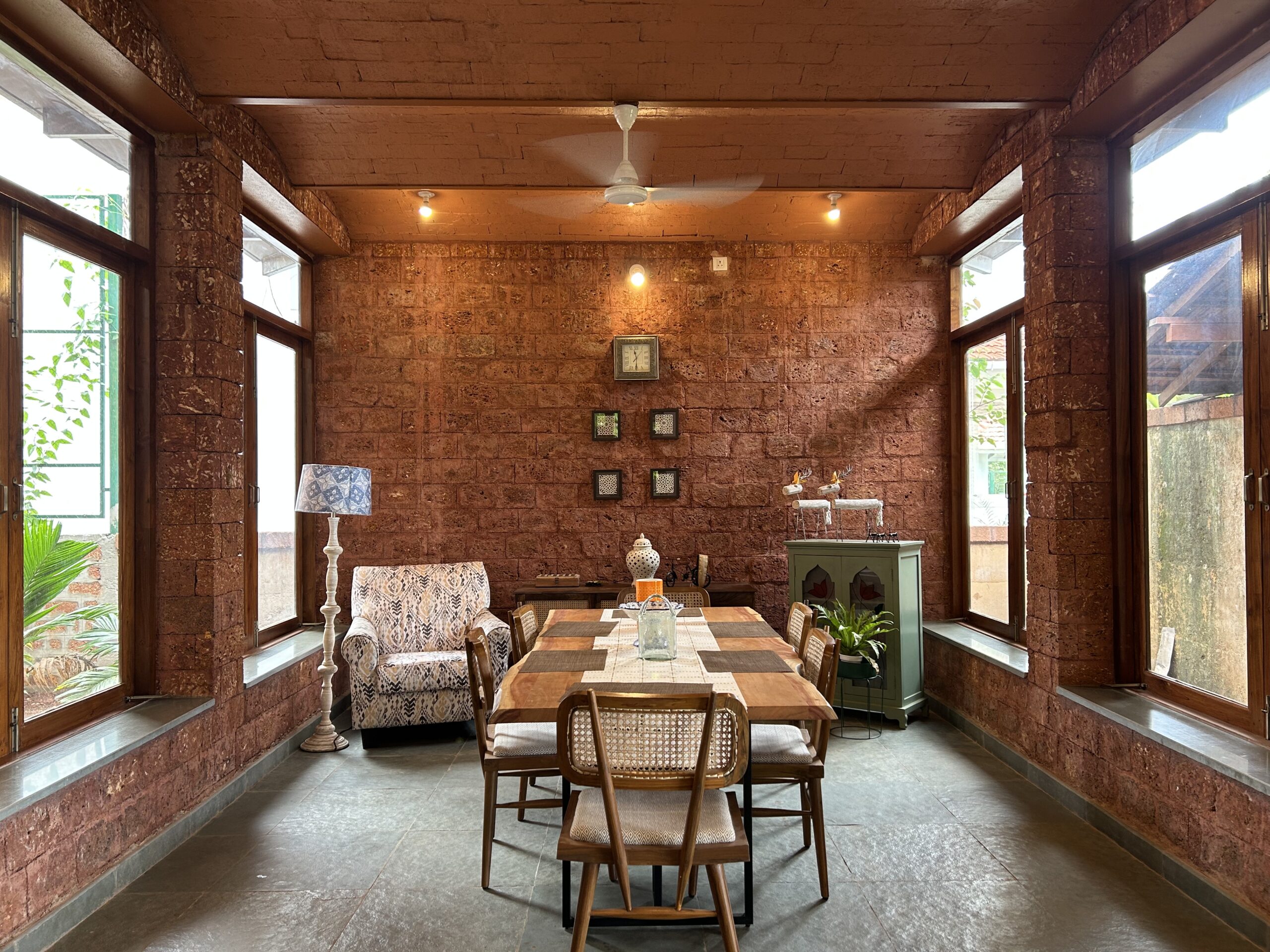 D’Silva harvests her palette from the ground itself. To her, material is never a moodboard—it’s an ethical and ecological imperative. To build a home in Panjim, she used reddish laterite that was quarried meters from the build site. By cutting it parallel to its natural grain, she revealed porous textures that allow the material to breathe and cool interior spaces through humid summers. A coconut tree, too venerable to fell, becomes the house’s structural pivot—its fronds forming a living canopy. There is no false ceiling or mechanical cooling: linear arched vaults made of brick support a load-bearing structure, deep overhangs redirect sun, and sloped roofs channel monsoon torrents into recharge pits.